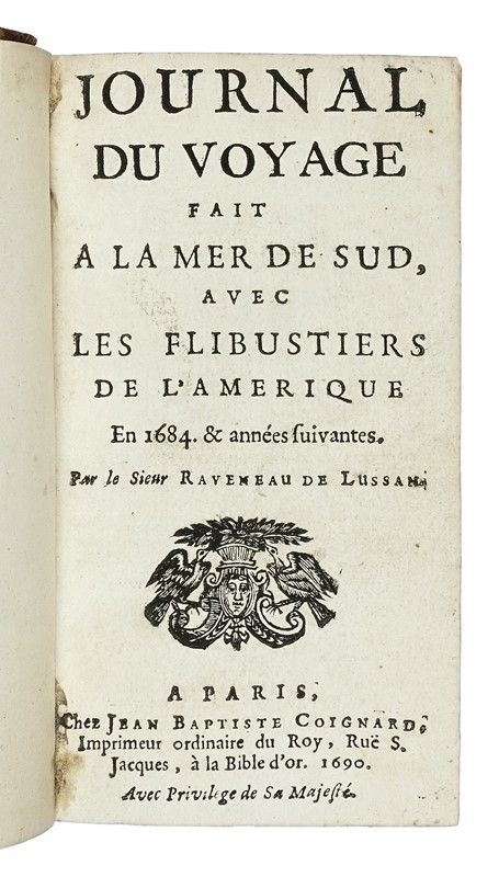 2 volumi in-12° (mm 165x95). Pagine [4], IX, [3], 388, [4]; [4], 2867 [i.e. 285], [3]. Strappi marginali nelle ultime carte di testo nel primo volume; nel secondo volume assente la carta M12 in fine. Volumi con sporadiche bruniture alle carte. Legatura coeva in piena pelle con titoli in oro su tassello al dorso, tagli rossi. Ex-libris di precedenti collezioni al contropiatto anteriore di ciascun volume. SI AGGIUNGONO: Histoire des Pirates Anglois [...] avec la vie et les avantures des deux Femmes Pirates Marie Read et Anne Bonny. A Paris: chez Etienne Ganeau, 1726. 1 volume in-8° (mm 183x105). Raveneau de Lussan Jacques, Journal du voyage Fait à la Mer de Sud, avec les flibustiers de l’Amerique en 1684 & années suivantes. Paris: Jean-Baptiste Coignard, 1690. 1 volume in-12° (mm 126x70). Esemplare con difetti.