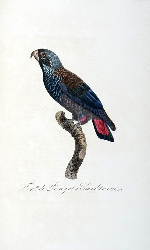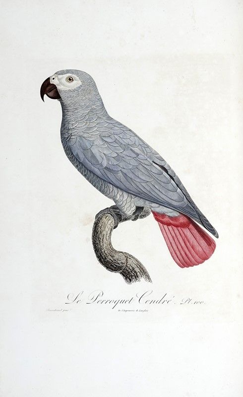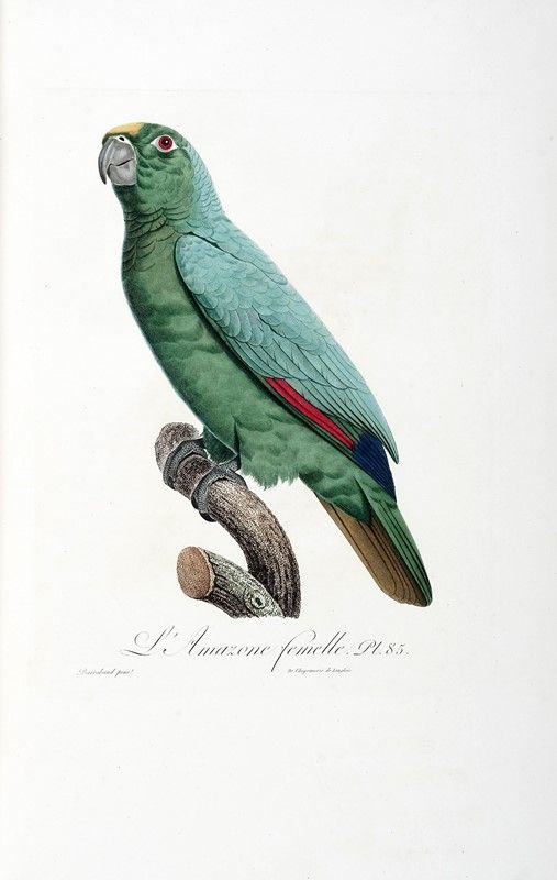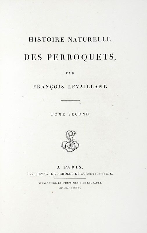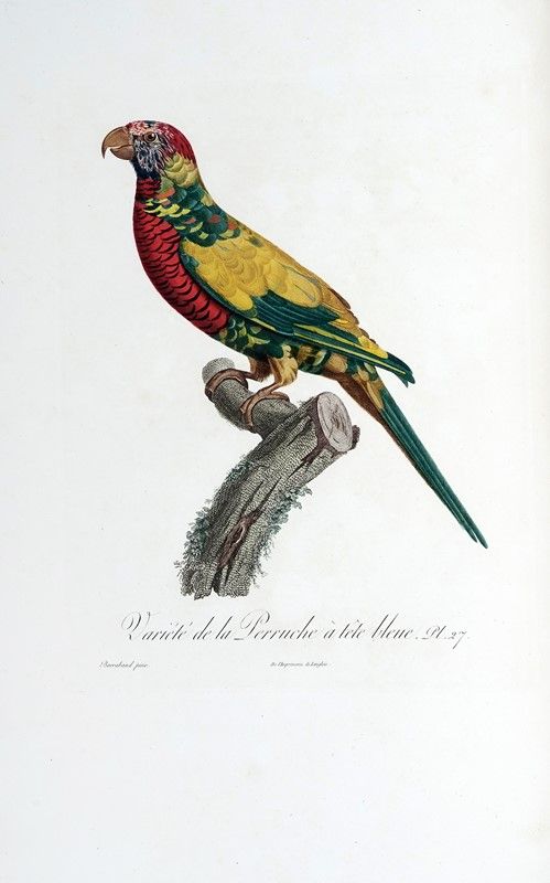 2 volumi in folio grande (mm 525x340). Pagine [8], 135 con 72 tavole fuori testo; [4], 112, [1], 1 bianca con 73 tavole fuori testo. Con, nel complesso, 145 splendide tavole incise a partire da disegni di Jacques Barraband e ritoccate all'acquerello. Alcune delle veline protettive presentano bruniture, rarissime carte con leggere fioriture ma nel complesso splendida copia, marginosa, fresca e con le tavole ottimamente conservate. Bella legatura coeva in mezzo marocchino rosso con piatti in carta colorata. Titolo e decorazioni a motivo ornitologico impressi in oro a ciascun dorso. Etichetta di precedente collocazione in corrispondenza della cuffia esterna di entrambi i volumi.