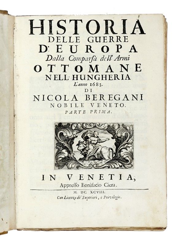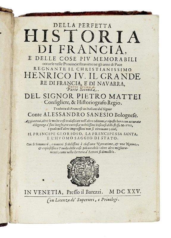2 volumi in-4° (mm 250x175). Pagine [12], 472, [28]; [2], 384, [34]. Assente l'ultima carta di entrambi i volumi. Invertiti i fascicoli Q e R del secondo volume. Antiporta calcografica e vignetta in rame ai frontespizi, capilettera in legno nel testo. Fascicoli iniziali lievemente allentati. Fioriture sparse alle carte. Pecetta di rinforzo al margine interno dell'antiporta del primo volume. Legatura in piena pergamena coeva con titoli manoscritti al dorso. Tagli spruzzati in rosso. Macchie ai piatti. SI AGGIUNGE: Guicciardini Francesco, La historia d'Italia [...] Riscontrata con tutti gli altri historici, & auttori, che dell'istesse cose habbiano scritto, per Tomaso Porcacchi... In Trevigi: appresso Fabritio Zanetti, 1604. In-8° (mm 204x147). Carte 22, [28], 488, 112. Vignetta xilografica al frontespizio. Bruniture concentrate ad alcune carte. Piccoli lavori di tarlo ad alcuni fascicoli che nopn coinvolgono il testo. Legatura in piena pergamena coeva con titoli manoscritti al dorso. Nota di possesso di mano antica al frontespizio. SI AGGIUNGE: Fiorelli Giacomo, Detti, e fatti memorabili del senato, e patritij Veneti... Venetia: presso Combi e La Noù, 1672. In-8° (mm 238x173). Pagine [12], 283, [17]. Vignetta xilografica al frontespizio, capilettera e testatine in legno nel testo. Esemplare in barbe. Prime 2 carte staccate ma presenti. Sporadiche fioriture. Legatura in pieno cartonato coevo con titoli manoscritti al dorso. Macchie ai piatti. Legatura staccata. Nota di possesso di mano antica al foglio di guardia e al frontespizio. SI AGGIUNGE: Davila Enrico Caterino, Historia delle guerre civili di Francia... In Venetia: per Domenico Lovisa, 1703. In-8° (mm 225x160). Testatine a capilettera in legno nel testo. Mancanza all'angolo superiore dell'occhietto, senza perdita di testo. Bruniture concentrate ad alcune carte, fioriture sparse. Legatura in piena pergamena coeva con titoli manoscritti al dorso. Tagli spruzzati in rosso. SI AGGIUNGE: Mattei Pietro, Della perfetta historia di Francia, e delle cose piu memorabili occorse nelle provincie straniere... In Venetia: presso il Barezzi, 1625. In-4° (mm 216x156). Capilettera, testatine e finalini in legno nel testo. Esemplare gorato, con fioriture sparse alle carte. Legatura in mezza pelle con punte e piatti in cartonato e titoli in oro impressi su tassello in pelle al dorso. Vistose mancanze alla cuffia superiore e alle unghiature. Punte stanche.