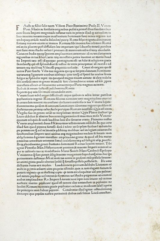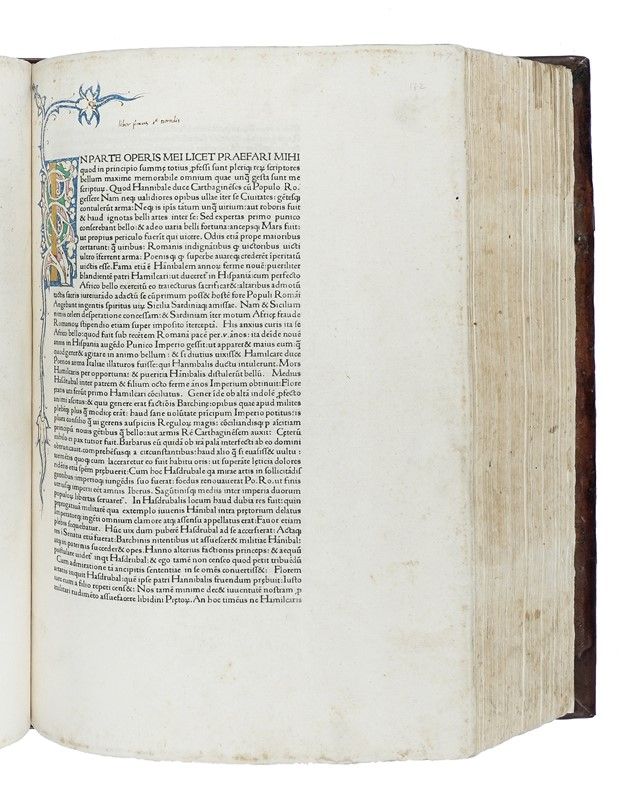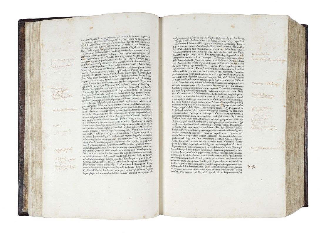 Folio massimo (mm 400x280). Carte [416] (di 421). Segnatura: [a-b12, c-l10, m10+1, n-p10, q-r8, s-z & aa-gg10 (- cc3-cc6), hh-kk10 (- hh1), ll-mm8, nn-rr10, ss14]. Testo in caratteri romani su 49 linee. Esemplare ad ampi margini, profusamente postillato. Iniziale dorata con decoro a tralcio di vite bianca su sfondo rosa, azzurro e verde all'inizio della Terza Decade (carta numerata 172 a matita). Annotazioni in inchiostro rosso e marrone; numerazione manoscritta a inchiostro rosso e successivamente a matita. Mancanti le carte [cc3-cc6] (numerate a matita 284-287) e la carta hh1 (numerata 312), tutte e 5 sostituite da una riproduzione facsimilare su carta antica. Gravi difetti e mancanze alla carta [c1], parzialmente sostituita in facsimile (i frammenti dell'originale sono sciolti nel volume) e con la parte inferiore lavata e con integrazione marginale. Mancanze marginali con integrazione, senza perdite, ad alcune carte, e con perdita alla carta numerata 152 a matita e 131 a inchiostro. Macchie, fioriture sparse e ampie gore, concentrate principalmente nell'ultima parte del volume; forellini di tarlo nel testo, con importanti perdite di inciso alle carte numerate a matita 259-283, 288-311, 313-421. Legatura coeva con piatti su assi di legno rivestiti in pelle, con dorso modernamente ricostruito e fermagli ai piatti con cinghie rinnovate e sguardie in pergamena. Decoro a tralci di vite bianca, in calce alla carta [c1r], contenente una corona d'alloro con lo stemma della famiglia Guicciardini di Firenze.