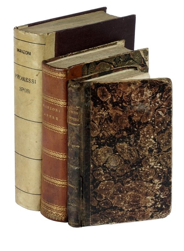 In-8° (mm 190x125). Con illustrazioni a piena pagina fuori testo. Legatura coeva in mezza pelle con piatti in carta marmorizzata e titoli in oro al dorso. SI AGGIUNGE: Id., I Promessi Sposi [...] nelle due edizioni del 1840 e 1825 raffrontate tra loro dal prof. Riccardo Folli. Milano: Domenico Briola, 1896. 1 volume in-4° (mm 220x140). SI AGGIUNGE: Foscolo Ugo, Ultime lettere di Jacopo Ortis. Terza edizione. Italia: s.e., 1802. 1 volume in-8° (mm 170x102).