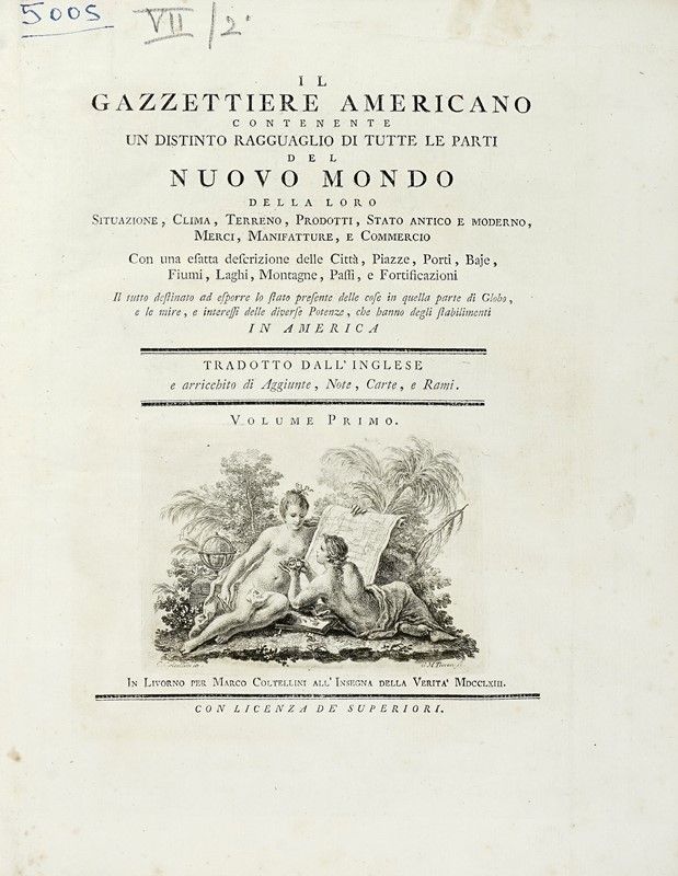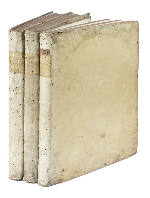 3 volumi in-4° grande (mm 312x245). Pagine XXIII, 1 bianca, 216, [1],1 bianca con 31 tavole fuori testo; 256, [1], 1 bianca con 23 tavole fuori testo; 253, [2], 1 bianca con 24 tavole fuori testo. Con, nel complesso, 78 tavole calcografiche fuori testo, molte ripiegate, raffiguranti mappe, scorci e fauna del Nuovo Mondo. Occasionali lievi gore marginali e poche carte fiorite (specialmente nel primo volume), nel terzo volume lavoro di tarlo che attraversa i fascicoli con perdita talvolta di piccole porzioni di testo e inciso ma nel complesso ottima copia, marginosa, completa e con le tavole ottimamente conservate. Legatura coeva in piena pergamena rigida con titoli in oro su falso tassello al dorso. Lavori di tarlo lungo i dorsi e le unghiature.