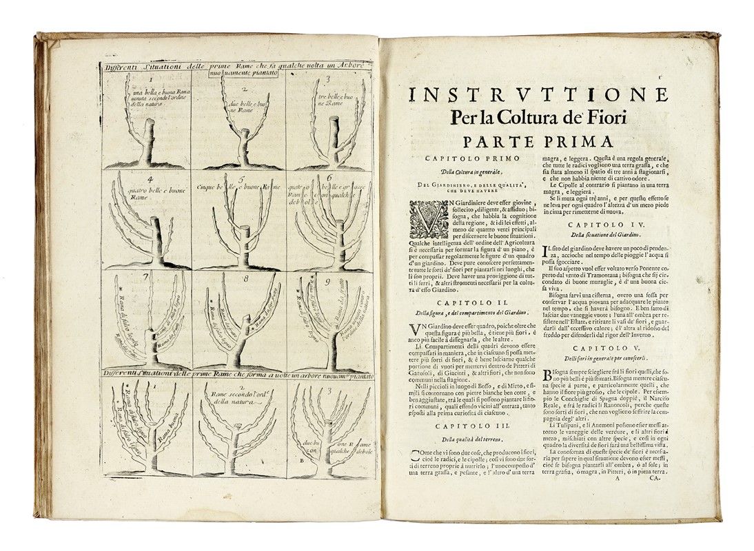In-4° (mm 305x203). Pagine [4], 55, 20. Con 3 tavole calcografiche nel testo e 1 (di 6) fuori testo, raffiguranti alberi a figura parziale e in sezione. Monogramma dell'editore in legno al frontespizio. Fori di tarlo, alcuni dei quali coinvolgono l'inciso, alle prime carte di testo; fioriture e macchie sparse. Legatura coeva in piena pergamena, con titoli manoscritti al dorso. Macchie ai piatti. Nota di possesso al frontespizio e annotazione al recto del foglio di guardia anteriore. SI AGGIUNGE: Liger Louis, Le jardinier fleuriste, ou la culture universelle des fleurs, arbres, arbustes, arbrisseaux servant à l'embellissement des jardins... A Rouen: chez la veuve de Pierre Dumesnil, 1787. In-12° (mm 168x85). SI AGGIUNGE: Pareto Raffaele, Irrigazione e bonificazione dei terreni. Trattato dell'impiego delle acque in agricoltura [...] prima versione italiana con note [...] Opera corredata di Atlante. Milano: Stabilimento Saldini, 1855-1857. 1 volume di testo e 1 volume di tavole in-8° (mm 252x170). Lotto non passibile di restituzione.