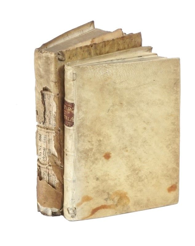 In-8° (mm 135x92). Carte 103, [13]. Assente l'ultima carta bianca. Vignetta e riquadro decorativo in legno al frontespizio. Testatine xilografiche abitate nel testo. Esemplare rifilato al margine superiore con perdita di parte della prima riga di testo. Una gora d'acqua alla prima carta, parzialmente staccata. Legatura in piena pergamena rigida con titoli in oro su tassello in pelle al dorso. Macchie al piatto anteriore. SI AGGIUNGE: Emesenus Heliodorus, La dilettevole historia... In Genova: [Antonio Roccatagliata], 1582. In-8° (mm 151x101). Pagine 24, 398 [i.e. 399], [1]. Marca xilografica al frontespizio. Testatine, capilettera e finalini in legno nel testo. Carta A8 staccata ma presente. Pagine brunite, gore d'acqua ai margini di tutto il volume. Legatura muta in piena pergamena molle. Copiose mancanze al dorso.