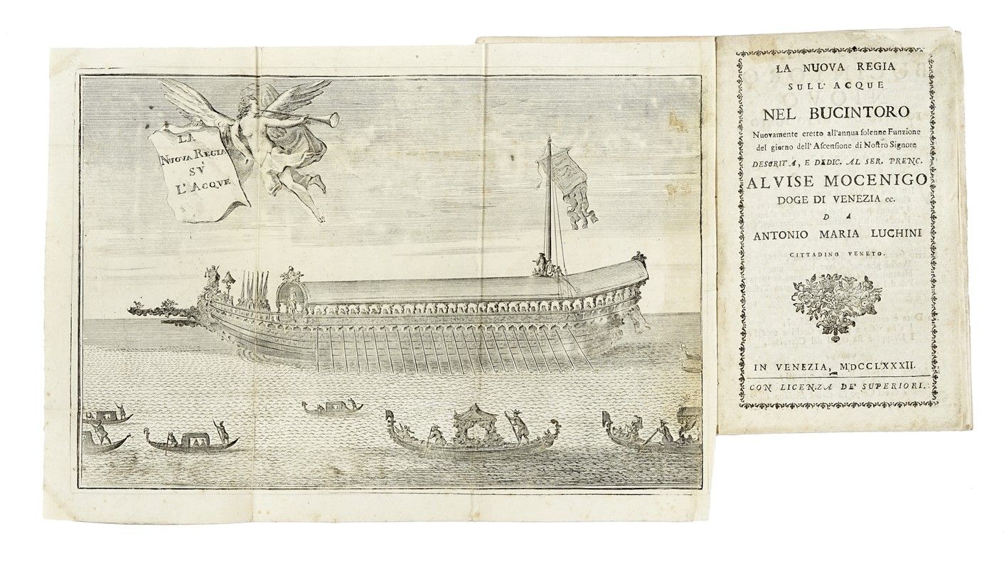 In-8° piccolo (mm 172x105). Pagine 49 con una tavola più volte ripiegata raffigurante il Bucintoro e 3 tavole a piena pagina fuori testo, provenienti da altra edizione. Copia restaurata nel margine superiore esterno delle carte, con parziale perdita di alcune lettere di testo. Tavola con piccoli restauri. Legatura in pieno cartonato decorato.