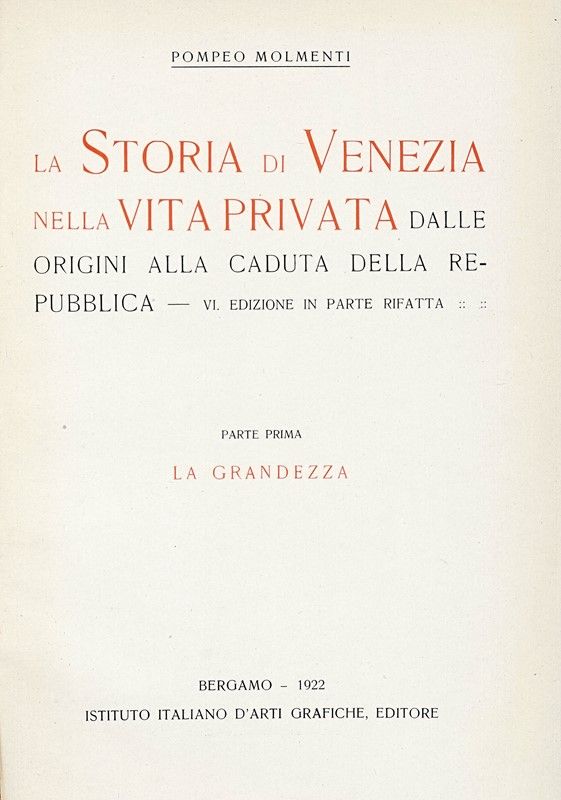 3 volumi in-4° (mm 270x185). Numerose illustrazioni nel testo e fuori testo, in parte a colori. Legatura editoriale originale in tutta tela rossa con titolo impresso in oro e nero a piatti e dorso e medaglione con il leone marciano a sbalzo al centro del piatto anteriore di ciascun volume.