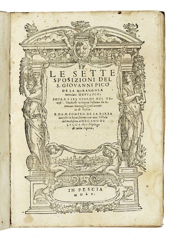 In-4° (mm 207x144). Pagine 158, [2] bianca. Frontespizio entro cornice xilografica manieristica contenente lo stemma dei Medici e la veduta di Firenze; illustrazione xilografica al verso del frontespizio; capilettera in legno. Gore marginali sparse; fioriture e lievi bruniture concentrate ad alcune carte. Legatura in pergamena floscia coeva; titolo manoscritto al dorso e al taglio superiore; lacerti di legacci. Macchie e gore ai piatti.