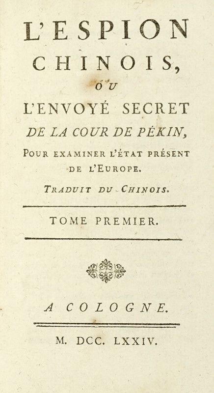 6 volumi in-12° (mm 165x95). Legatura coeva in piena pelle con titoli in oro su tassello al dorso. Tagli rossi, sguardie in carta marmorizzata. Alcune macchioline sui piatti. Ex-libris di precedente proprietario applicato al contropiatto anteriore di ciascun volume. SI AGGIUNGONO: Id., L'espion françois a Londres, ou Observations critiques sur l'Angleterre et sur les anglois. Premier (-second) volume. A Londres: aux dépens de l'auteur, 1780. 2 parti in 1 volume in-12° (mm 168x95). Marana Giovanni Paolo, L'Espion Turc dans les Cours des Princes Chretiens... Tome premier (-septieme). A Londres: aux depens de la Compagnie, 1742. 7 volumi in-8° (mm 180x110).