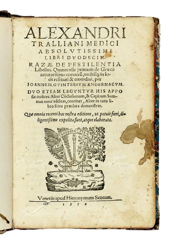 In-8° (mm 156x105). Carte [12], 247, [1]. Marca xilografica al frontespizio e in fine, capilettera in legno nel testo. Copia con sporadiche gore marginali e un piccolo lavoro di tarlo sul frontespizio, per il resto ben conservata e completa. Legatura ottocentesca in mezza pelle con punte e piatti in carta marmorizzata. Titoli in oro al dorso, tagli rossi. Alcune mancanze ai piatti.