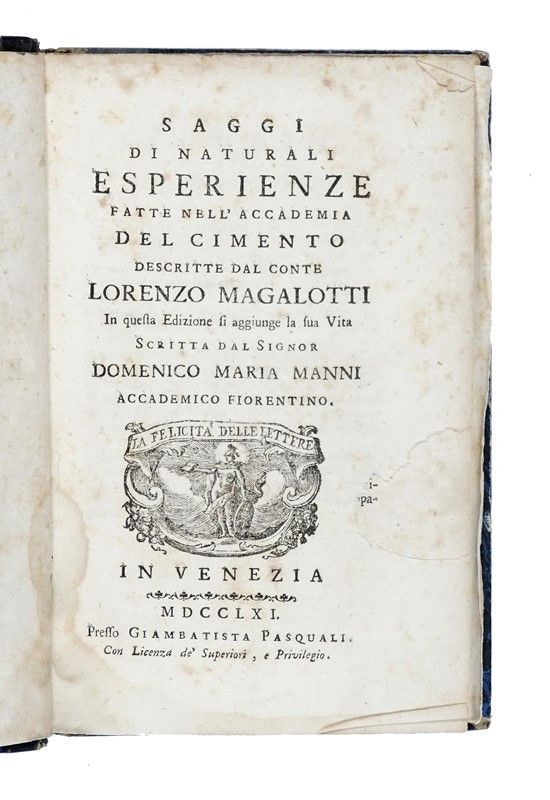 Compongono il lotto: 1) Lemery Nicolas, Corso di chimica... In Venetia: Gio. Giacomo Hertz, 1697. 2) Id., Cours de chymie contenant la maniere de faire [...] Onzième edition. A Paris: Jean-Baptiste Delespine, 1730. 3) Magalotti Lorenzo, Saggi di naturali esperienze fatte nell'Accademia del Cimento... In Venezia: Giambattista Pasquali, 1761. 4) Bonvicino Costanzo Benedetto, Elementi di chimica farmaceutica e d'istoria naturale [...] Tomo primo (-secondo, parte seconda). Torino: Stamperia dipartimentale, 1810. 5) Gallo Giuseppe, Nuovo trattato elementare di chimica inorganica ed organica applicata alla medicina ed all'economia domestica [...] Vol I (-II). Torino: Giuseppe Fodratti, 1850. 6) La chimica insegnata in ventisei lezioni ossia elementi di chimica generale... Torino: Alliana e Paravia, 1825.