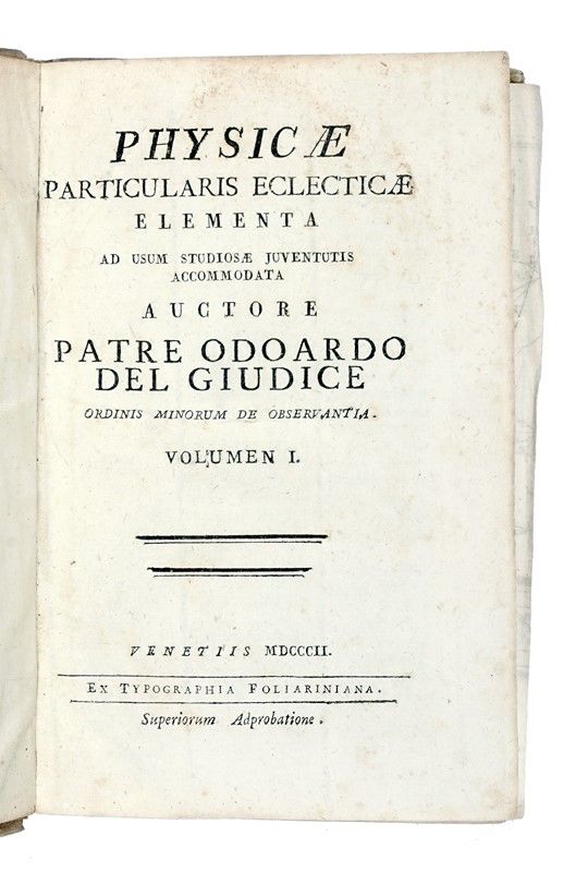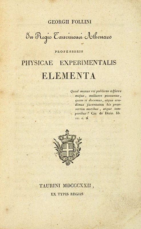 Compongono il lotto: 1) Doveri Leonardo, Elementi di fisica e sue principali applicazioni [...] Vol I (-II). Firenze: Tipografia galileiana, 1854-55. 2 tomi in 1 volume in-8° (mm 207x135). 2) Corti Bonaventura, Institutiones physicae quas in tyronum suorum [...] Tomus Primus (-secundus). Mutinae: Johannis Montanari, 1769-70. 2 volumi in-8° (mm 186x115). 3) Physicae experimentalis lineamenta ad subalpinos. Pars prima (-altera). Taurini: ex typographia Regia, 1793-94. 2 volumi in-8° (mm 191x124). 4) Georgii Follini, Physicae experimentalis elementa... Taurini: ex typis regiis, 1822. In-8° (mm 200x127). 5) Id., Physicae experimentalis elementa. Editio altera notationibus aucta. Taurini: ex typis regiis, 1823. In-8° (mm 181x117). Elenco completo disponibile su richiesta.
