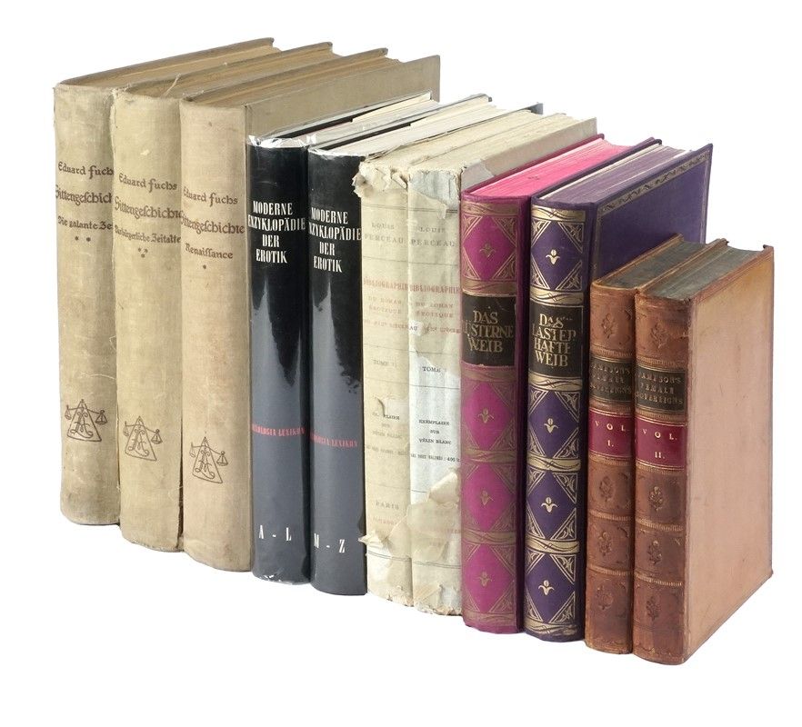 Compongono il lotto: 1) Das Lusterne Weib. Sexualpsychologie der begehrenden unbefriedigten und schamlosen frau. Wien: Kulturforschung, 1929; 2) Das lasterhafte Weib. Bekenntnisse und Bilddokumente zu den Steigerungen und Aberrationen im weiblichen Triebleben... Wien: Kulturforschung, 1930; 3) Moderne Enzyklopädie der Erotik [...] A-L (-M-Z). Wien: Kurt Desch., 1963 (2 volumi); 4) Memoirs of Celebrated Female Sovereigns [...] Vol. I (-II). London: Saunders and Otley, 1834 (2 volumi); 5) Perceau Louis, Biblighraphie du roman érotique au XIXe siècle. Tome premier (-deuxième). Paris: Fourdrinier, 1930 (2 volumi); 6) Fuchs Eduard, Illustrierte Sittengenschichte vom mittelalter bis zur gegenwart. Munchen: Albert Langen, 1909 (3 volumi).