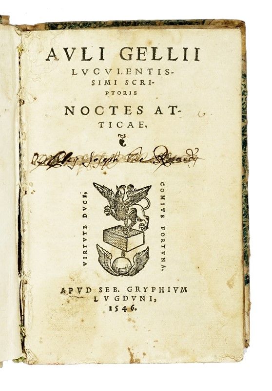 In-8° (mm 160x105). Pagine [64], 533, [1], 2 bianche. LEGATO CON: Schade Petrus, In Auli Gellii Noctes Atticas, annotationes... Lugduni: apud Seb. Gryphium, 1542. Pagine 213, [3]. Lavoro di tarlo in principio e fine di volume, negli ultimi fascicoli con perdita dell'angolo superiore esterno delle carte, sporadiche gore. Legatura successiva in mezza pergamena con punte e piatti in carta marmorizzata. Titoli in oro su tassello al dorso, tagli spruzzati. Antica nota di possesso cassata sul frontespizio. SI AGGIUNGE: Seneca Lucius Annaeus, Opera (-Operum alter tomus). Lugduni: apud Seb. Gryphium, 1555. 2 volumi in-8° (mm 163x110). Volumi fittamente postillati da mano antica. Legatura in piena pergamena rigida con titoli manoscritti al dorso. Nota di possesso manoscritta anticamente cassata sul frontespizio.
