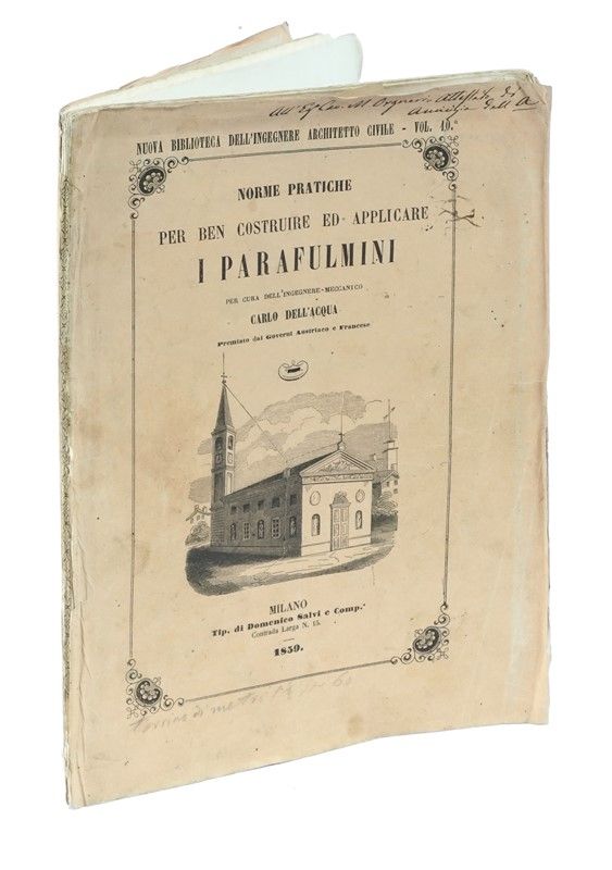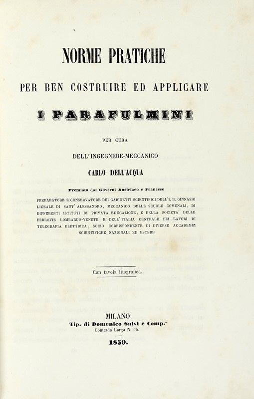 In-8° (mm 260x180). Pagine 37, [3], con una tavola litografica più volte ripiegata, rilegata in fine. Lievi fioriture sparse, anche alla tavola, la quale si presenta leggermente brunita. Brossura originale, con illustrazione e titoli in nero al piatto anteriore, entro graziosa cornice tipografica, rivestita in acetato trasparente. Dedica manoscritta dell'Autore al piatto anteriore. Mancanze al doro e altre minime mende. SI AGGIUNGONO: 2) Id., Proposta di modificazioni scientifico-pratiche alle punte dei parafulmini. Compendio di memoria letta nella seduta del 13 luglio 1865 dell'Ateneo di Milano...; 3) Etichetta pubblicitaria coeva dell'officina idraulica di Carlo Figini (Bergamo); 4) Lista, con relativi prezzi, di materiale utile alla costruzione di parafulmini.