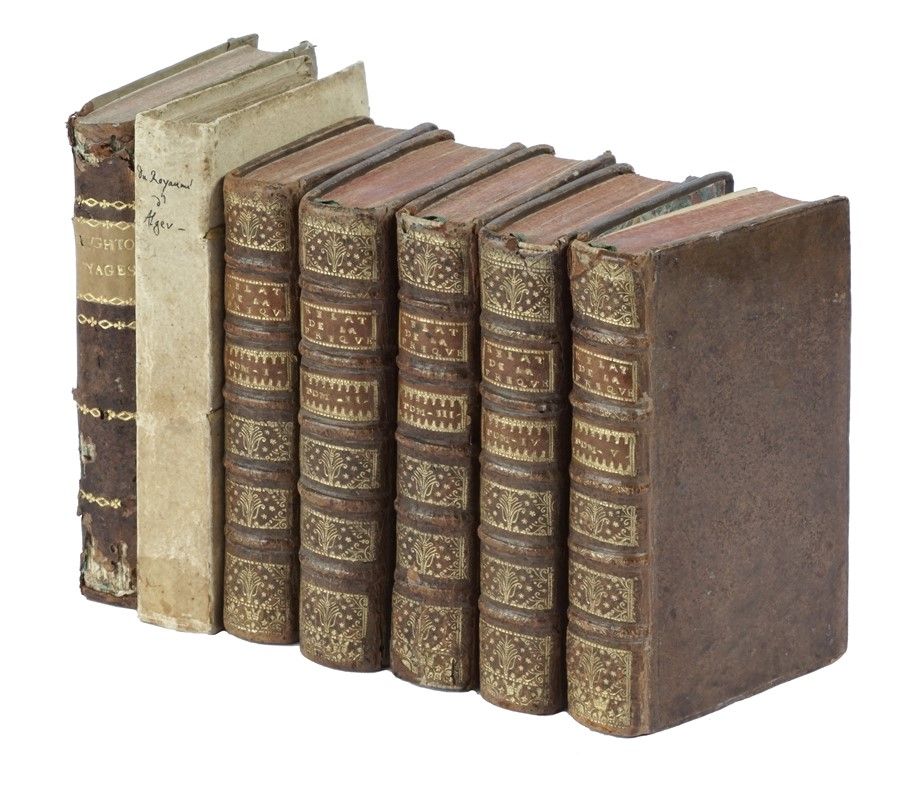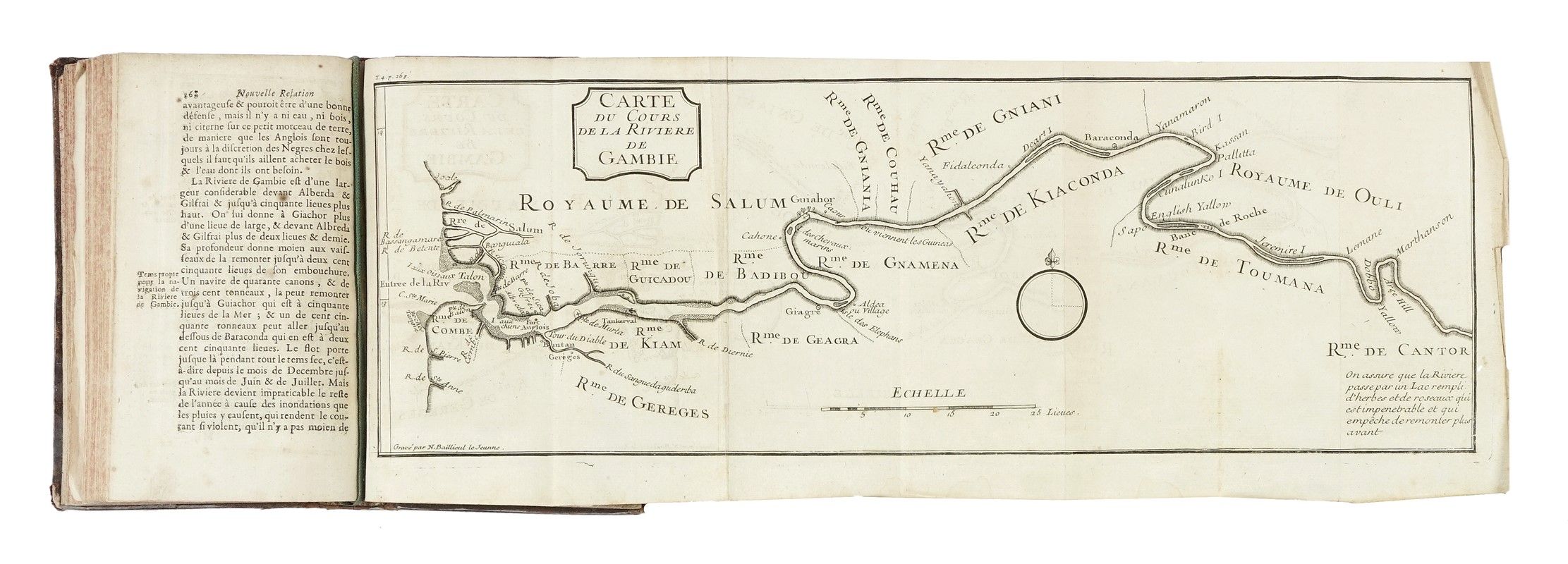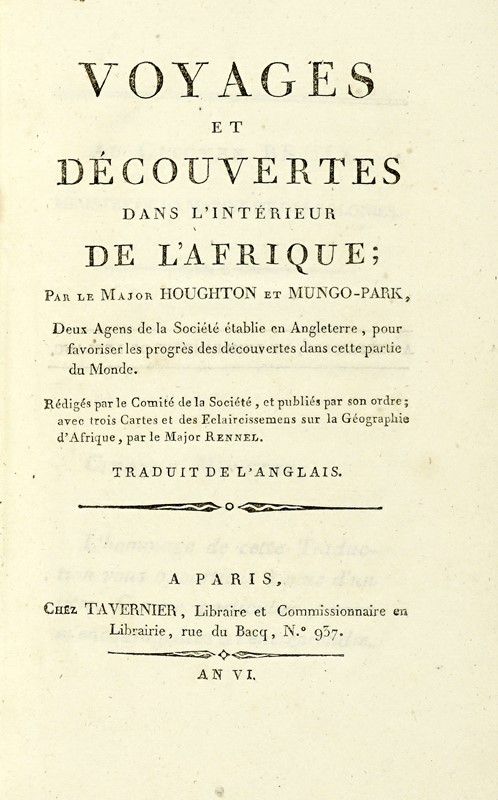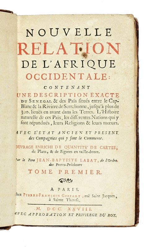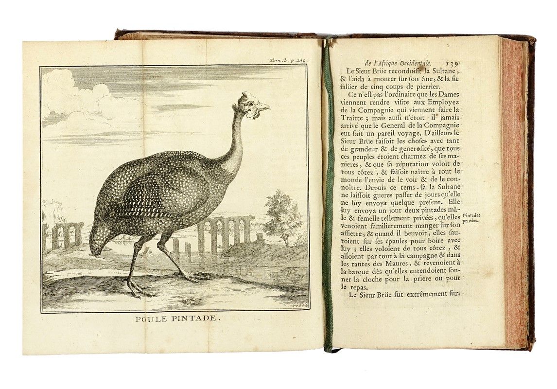 5 volumi in-12° (mm 165x95). Pagine [4], XVII, [7], 346, 2 bianche con 8 tavole fuori testo, di cui 7 carte geografiche ripiegate; [4], II, 376 con 27 tavole fuori testo, di cui 22 ripiegate; [4], II, 387, 1 bianca con 14 tavole fuori testo, di cui 10 ripiegate; [6], 392 con 16 tavole fuori testo, di cui 15 ripiegate; [6], 404 con 12 tavole fuori testo, di cui 7 ripiegate. Con complessivamente 77 [di 78] tavole fuori testo, di cui 61 ripiegate e raffiguranti mappe, vedute, flora e fauna locale. Al primo volume strappo marginale alla carta del Senegal, ai volumi alcune carte brunite, sporadiche fioriture, ma copia complessivamente ben conservata. Legatura coeva in piena pelle con titoli e decorazioni in oro al dorso, tagli spruzzati, sguardie in carta marmorizzata. Ex-libris di precedente proprietario al contropiatto di ciascun volume. SI AGGIUNGONO: Houghton, Mungo Park, Voyages et découvertes dans l'interieur de l'Afrique... A Paris: chez Tavernier, [1797]. 1 volume in-8° (mm 185x115). Laugier de Tassy Jacques Philippe, Histoire du royaume d'Alger. A Amsterdam: chez Henri du Sauzet, 1725. 1 volume in-8° (mm 180x105).