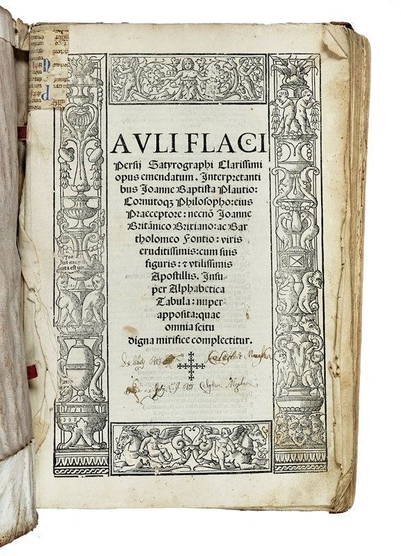 In folio (mm 310x210). Carte [10], CIIII. Frontespizio entro cornice xilografica, legni nel testo. Copia con i primi fascicoli allentati, alcune mancanze al frontespizio, lievemente e uniformemente brunita, con una gora d'acqua che interessa circa dieci carte nella seconda metà del volume. Legatura coeva in piena pergamena floscia. Mancanze al piatto anteriore. Sul piatto posteriore note manoscritte di mano antica quasi totalmente sbiadite. Note manoscritte anche al verso dell'ultima carta di testo. Rilegate in fine due carte provenienti da altro volume, con difetti.