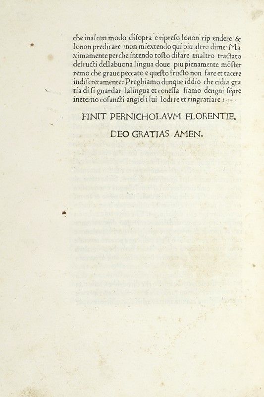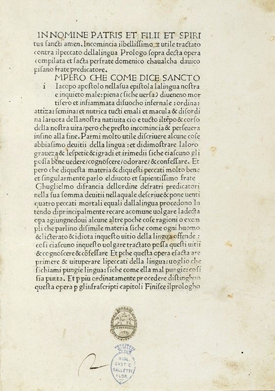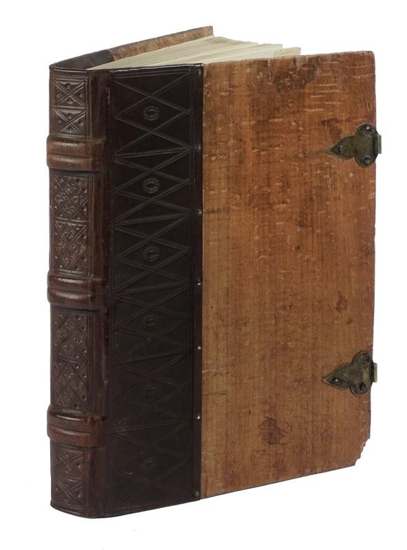 In-4° (mm 272x191). Carte [117] (di 118). Segnatura: a10, b–p8, q4 (-q4). Testo in caratteri romani, su 31 righe. Spazi per iniziali con letterine guida. Mancante la carta q4 bianca. Fioriture e qualche macchiolina sparsa, altrimenti ottimo esemplare marginoso. Legatura con assi lignee coeve e dorso in cuoio posteriore fissato con chiodi e fregiato a secco in stile d'epoca; fermagli ai piatti e tagli gialli. Scheggiature e mancanze alle punte, altrimenti buone condizioni. Ex libris d'arme (Francesco Ricciardi di Vernaccia) ed ex-libri del Barone Horaz Von Landau al contropiatto anteriore; timbro a inchiostro Conte Gustavo Galletti di Firenze e piccola etichetta stemma (FM de Angelis) in calce alla carta a1; ex-libri cartaceo (MB) sciolto.