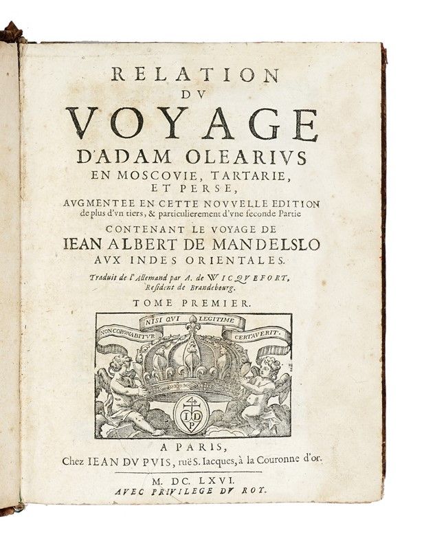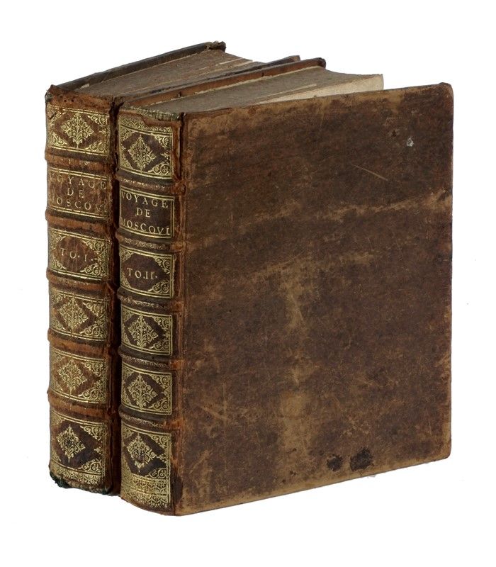2 volumi in-4° (mm 235x180). Pagine [54], 586 [i.e. 576]; [46], 648 [i.e. 644] + 6 carte geografiche incise in rame fuori testo più volte ripiegate. Marca dello stampatore incisa in legno ai frontespizi, capilettera e testatine xilografici. Errori nella numerazione delle pagine ma testo ben completo. Esemplare discreto, con lievi bruniture sparse, tracce di arrossature e piccoli strappetti alle tavole, tuttavia marginali. Legatura coeva in piena pelle con titoli e decorazioni impresse in oro ai dorsi a 5 nervi, tagli marmorizzati. Piatti e dorsi un poco lisi.
