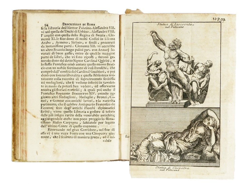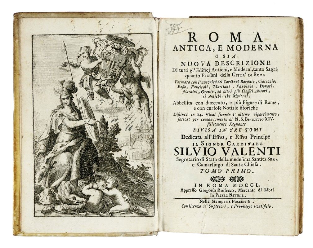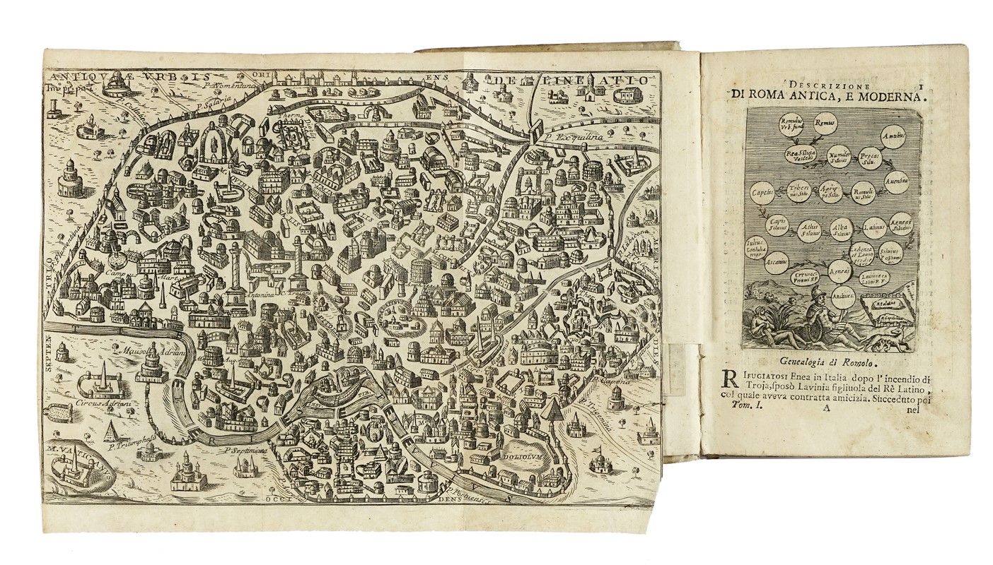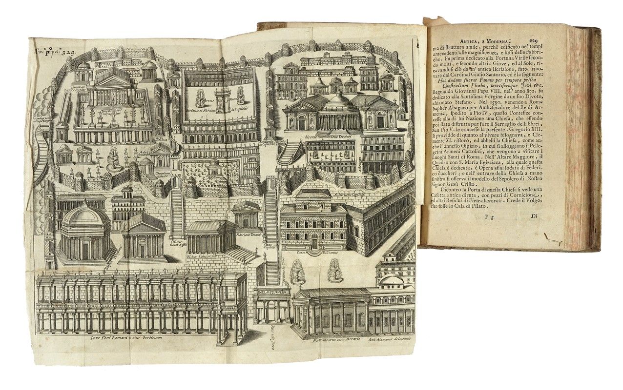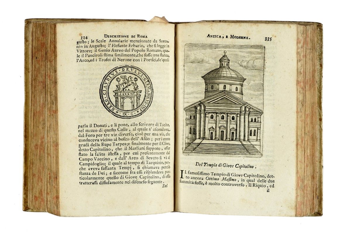 3 volumi in-8° (mm 163x109). Pagine [4], XVI, 654 [i.e. 656] (le pagine 498-499 si ripetono) + 20 tavole in rame ripiegate; [4], 694, [2], con + 11 tavole in rame ripiegate; [8], 523, [5] + 1 tavola in rame e 1 tabella in legno ripiegata. In tutti e tre i volumi antiporta inciso, nel testo innumerevoli incisioni di medaglie e vedute di Roma. Bruniture alle carte, più intense ad alcuni fascicoli, tracce di umidità e fioriture sparse. Lavoro di tarlo al margine inferiore dei fascicoli O-Q e 2F-2I del volume I; dal fascicolo 2N fino alla fine, lavoro di tarlo nella parte centrale, con parziale perdita di testo. Piccoli restauri con pecette di rinforzo al verso della tavola legata a pagina 229 e all'angolo inferiore degli ultimi fascicoli. Al volume II restauro al margine inferiore di H2v, al volume III al margine superiore di 2K4. Legati in posizione errata i fascicoli Q e F del volume III. Altri piccoli marginali difetti. Legatura coeva in piena pergamena con titoli in oro su falso tassello al dorso. Tagli spruzzati. Una mancanza alla cuffia inferiore del volume I. Nota manoscritta a penna al piatto anteriore dello stesso. Timbro di precedente collezione al frontespizio del volume III.