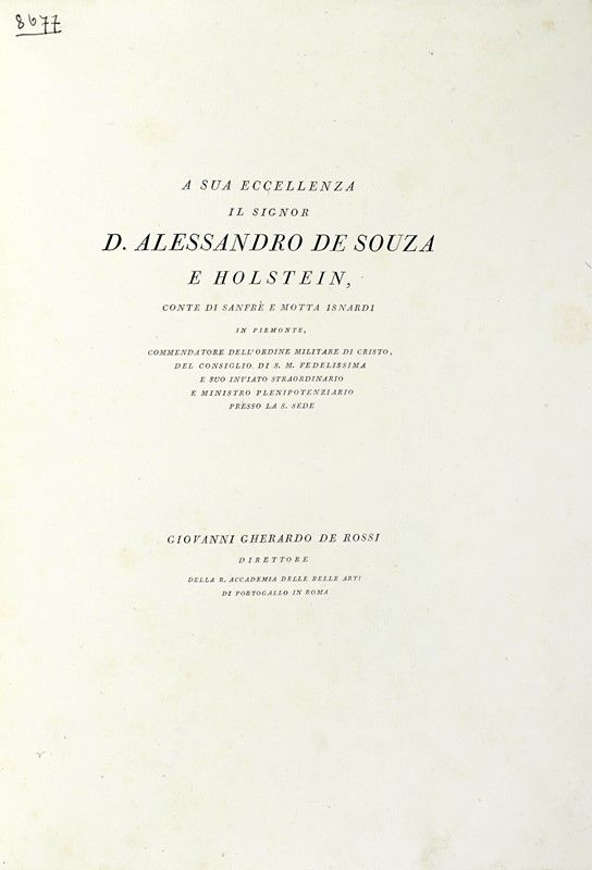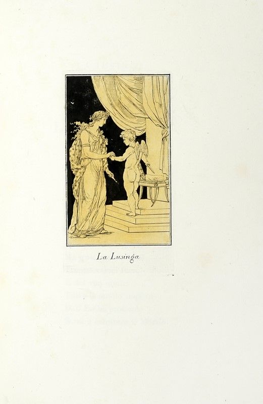 In-4° grande (mm 310x220). Carte [54] con 41 tavole a piena pagina fuori testo in coloritura incise da Francesco Rosaspina. La tavola L'ardire compagno d'Amore presenta una macchia nel margine interno non toccante l'inciso, per il resto copia genuina, in barbe e completa. Legatura coeva in mezzo marocchino rosso con piatti in carta decorata e titoli impressi in oro al dorso. Sguardie in carta blu marmorizzata. Brunitura da esposizione a entrambi i piatti.