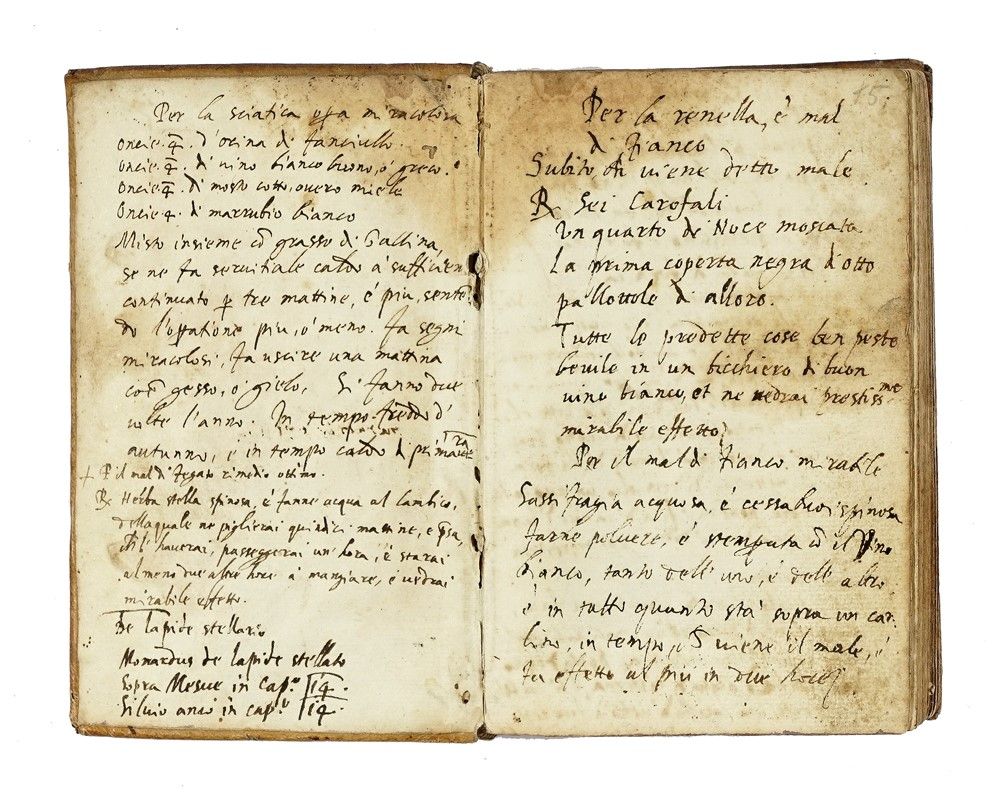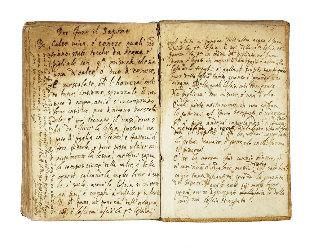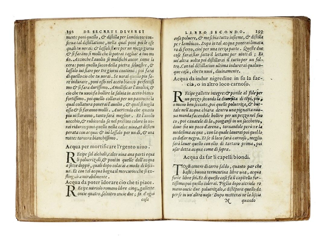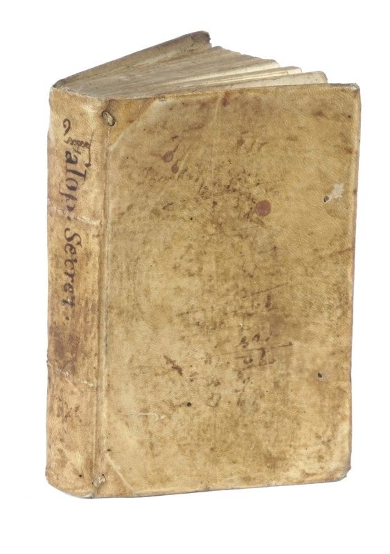 In-8° (mm 150x97). Pagine [32], 366, [2]. Marca tipografica in legno al frontespizio e al verso dell'ultima carta; capilettera xilografici. Ampia gora al margine superiore di tutto il volume; più accentuata, e con bruniture, ai fascicoli Y8-Z8. Legatura coeva in piena pergamena, con titoli manoscritti al dorso. Macchie e legacci mancanti ai piatti. Annotazione manoscritta marginale al frontespizio e al verso dell'ultima carta. Ricette manoscritte per sciatica, renella e per fare il sapone alle sguardie.