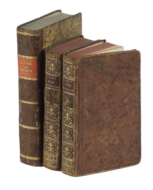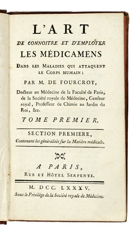 In-8° (mm 195x120). Pagine [4], VI, 585, 1 bianca con 1 tavola ripiegata fuori testo. Alcuni errori di rilegatura nell'ultimo fascicolo di testo, senza perdite, occasionali fioriture e macchioline. Legatura coeva in mezza pelle con piatti in carta marmorizzata e titolo in oro al dorso. SI AGGIUNGE: M. de Fourcroy, L'art de connoitre et d'employer les médicamens [...] Tome premier (-second). A Paris: Hotel Serpente, 1785. 2 volumi in-12° (mm 165x95). Legatura coeva in piena pelle con titoli in oro su tassello al dorso. Tagli rossi, sguardie in carta marmorizzata.
