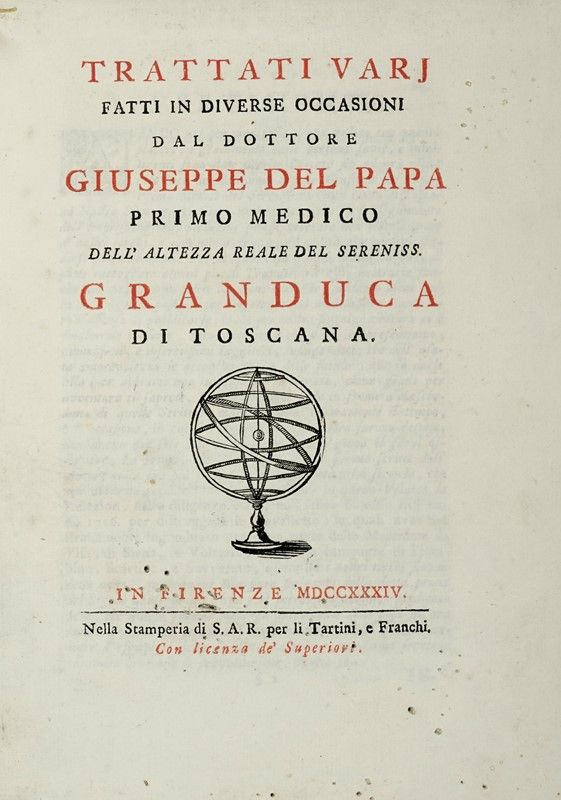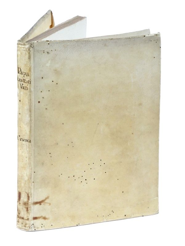 In-4° (mm 248x184). Pagine VI, [2], 228 con 1 tavola incisa in rame fuori testo. Capilettera, testatine e finalini xilografici. Frontespizio impresso a due colori. Forellini di tarlo nel margine inferiore dei fascicoli, più visibili alle prime due carte di testo e alle ultime 5. Legatura coeva in piena pergamena floscia con titolo manoscritto al dorso. Dorso leggermente allentato, fori di tarlo sui piatti.