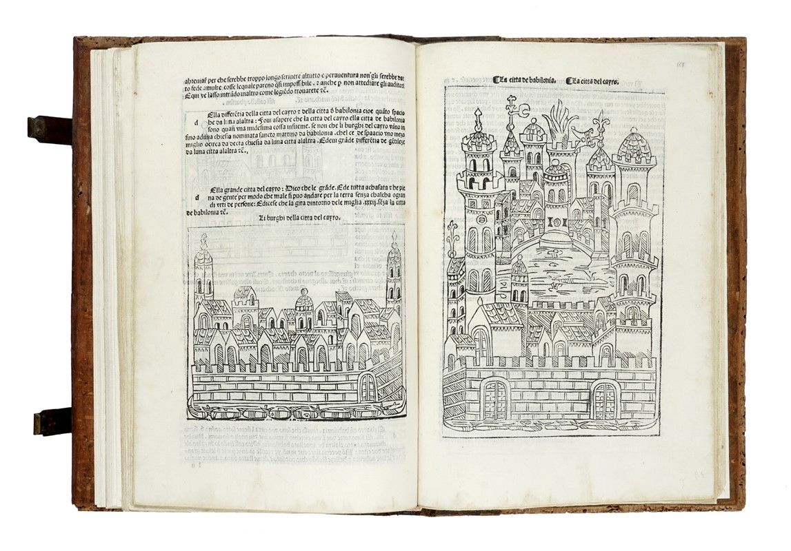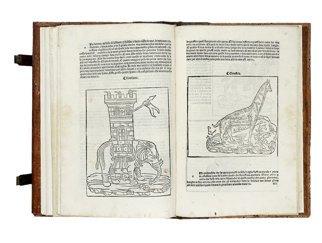 In-folio (mm 283x197). Carte [48] (di 68). Segnatura: a6 (-a6), b4 (-b4), c-d6 (-d6), e-h4 (-e4), i6, k-l4, m6, n4, o6. Testo in carattere gotico su 53 righe. Splendide illustrazioni xilografiche nel testo; marca xilografica al colophon. Spazi per iniziali con letterine guida. Mancanti i fascicoli a6 b4, d6 ed e4, tutti presenti in facsimile fotocopiato. Mancanze marginali reintegrate alla carta c1, c3, f4, k1, k2, l2, n3; con perdite alla carta o2-o5. Uno strappetto al margine inferiore della carta h1, qualche macchia, soprattutto all'ultima carta, e fioriture sparsa. Legatura in mezza pelle con piatti in legno coevo e dorso a 4 nervi e fermagli. Piatti fortemente tarlati e sguardie rinnovate.