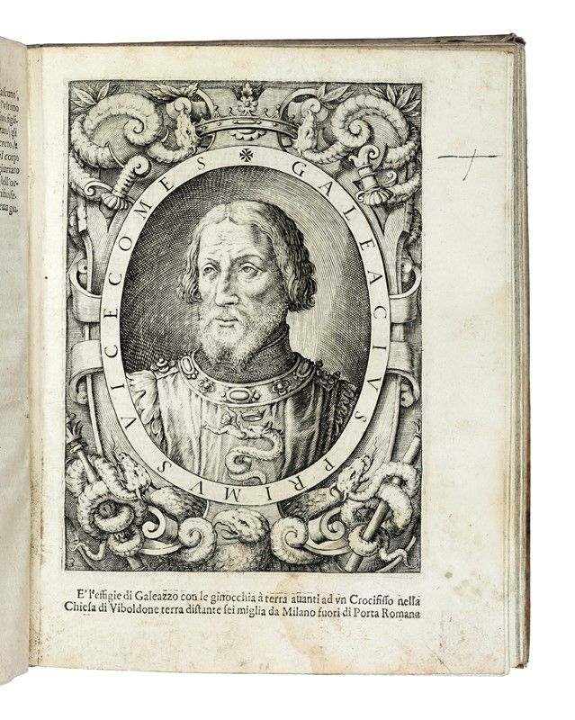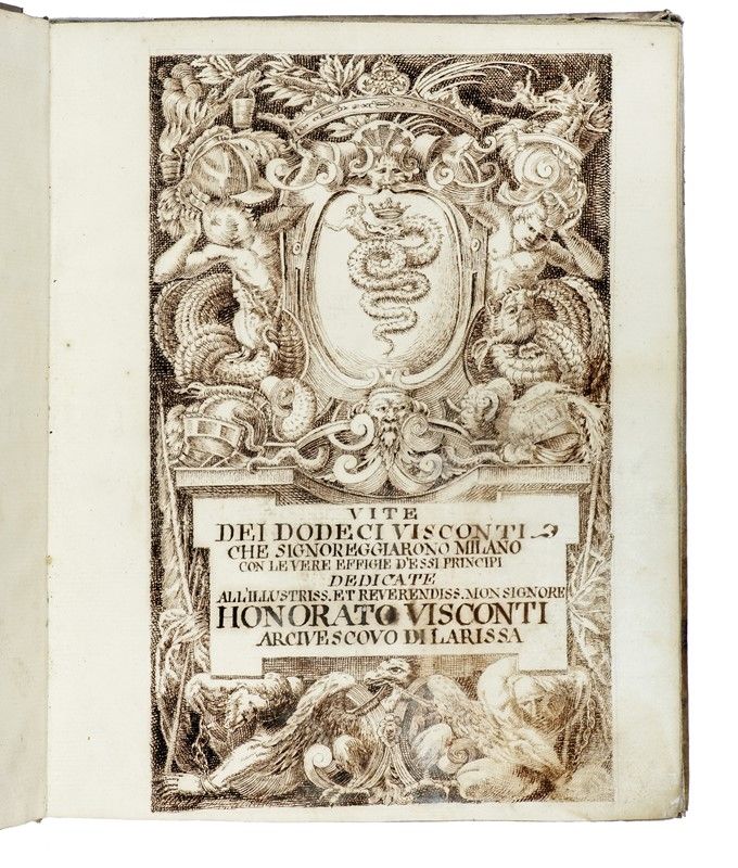In-4° (mm 243x190). Pagine [18], 132. Antiporta figurata incisa da Giovanni Paolo Bianchi raffigurante lo stemma araldico dei Visconti fiancheggiato da tritoni, ritratto del dedicatario dell’opera sul verso del frontespizio e 13 ritratti incisi a piena pagina; testatine, capilettera e finalini xilografici. Copia con difetti: primo fascicolo rimontato con pecetta di rinforzo, strappo che interessa il testo nelle carte 2+5, 2+6, A1, fascicoli gorati, rinforzi marginali a numerose carte. Legatura successiva in piena pergamena rigida con titolo in oro su tassello al dorso. Copia da studio, lotto non passibile di restituzione.