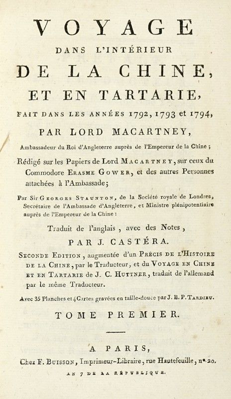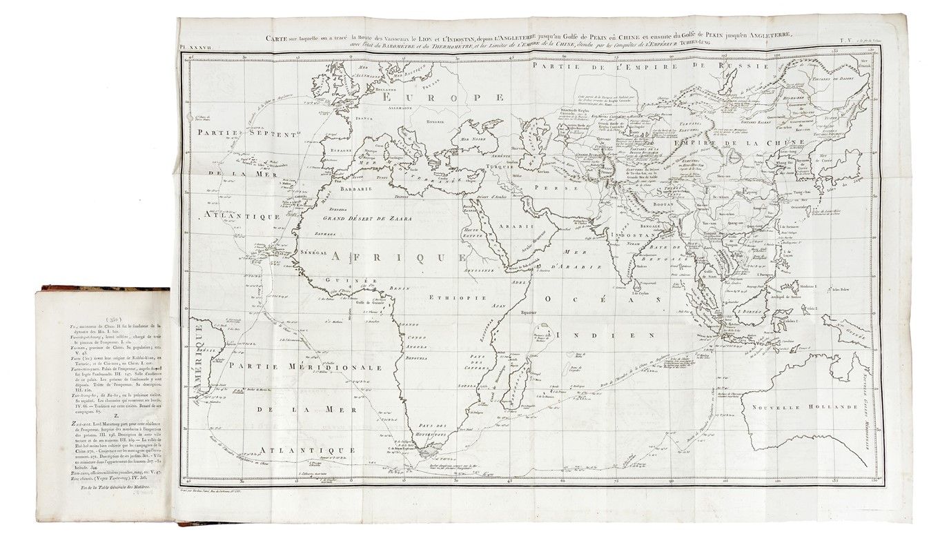 5 volumi in-8° (mm 194x120). Pagine [4], CLXXVI, 311, 1 bianca con 1 antiporta incisa e 5 tavole fuori testo; [4], 408 con 7 tavole fuori testo; [4], 414, [2] con 14 tavole fuori testo; [4], 380 con 8 tavole fuori testo; [4], 350 [i.e. 346] con 4 tavole fuori testo. Con, nel complesso, 1 antiporta incisa e 38 tavole ripiegate in calcografia tra carte geografiche e raffigurazioni di flora, fauna locale e paesaggi. Nel quinto volume lavoro di tarlo nel margine interno di pochi fascicoli e un errore di numerazione, senza perdite. In generale sporadiche fioriture ma buona copia, completa. Legatura coeva in mezza pelle con punte e piatti in carta decorata. Titolo in oro su tassello al dorso, tagli rossi. Sguardie rinnovate, mancanze lungo i dorsi. Ex-libris di precedente collezione al contropiatto anteriore di ciascun volume. SI AGGIUNGE: Sonnerat Pierre, Voyage aux indes orientales et a la Chine. Fait par ordre du Toy, depuis 1774 jusqu'en 1781 [...]. Tome premier (-troisieme). A Paris: chez l'auteur [...] Froulle, libraire [...] Nyon [...] Barrois [...], 1782. 3 volumi in-8° (mm 210x135). Pagine XXII, 340, 2 bianche con 1 tavola fuori testo; [6], 376 con 2 tavole fuori testo; [6], 362 con 3 tavole fuori testo. Nel complesso 6 [di 7] tavole ripiegate fuori testo incise in calcografia. Copia parzialmente fiorita. Legatura moderna in piena carta decorata con titoli in oro su tassello al dorso. Ex-libris di precedente proprietario al contropiatto anteriore di ciascun volume.