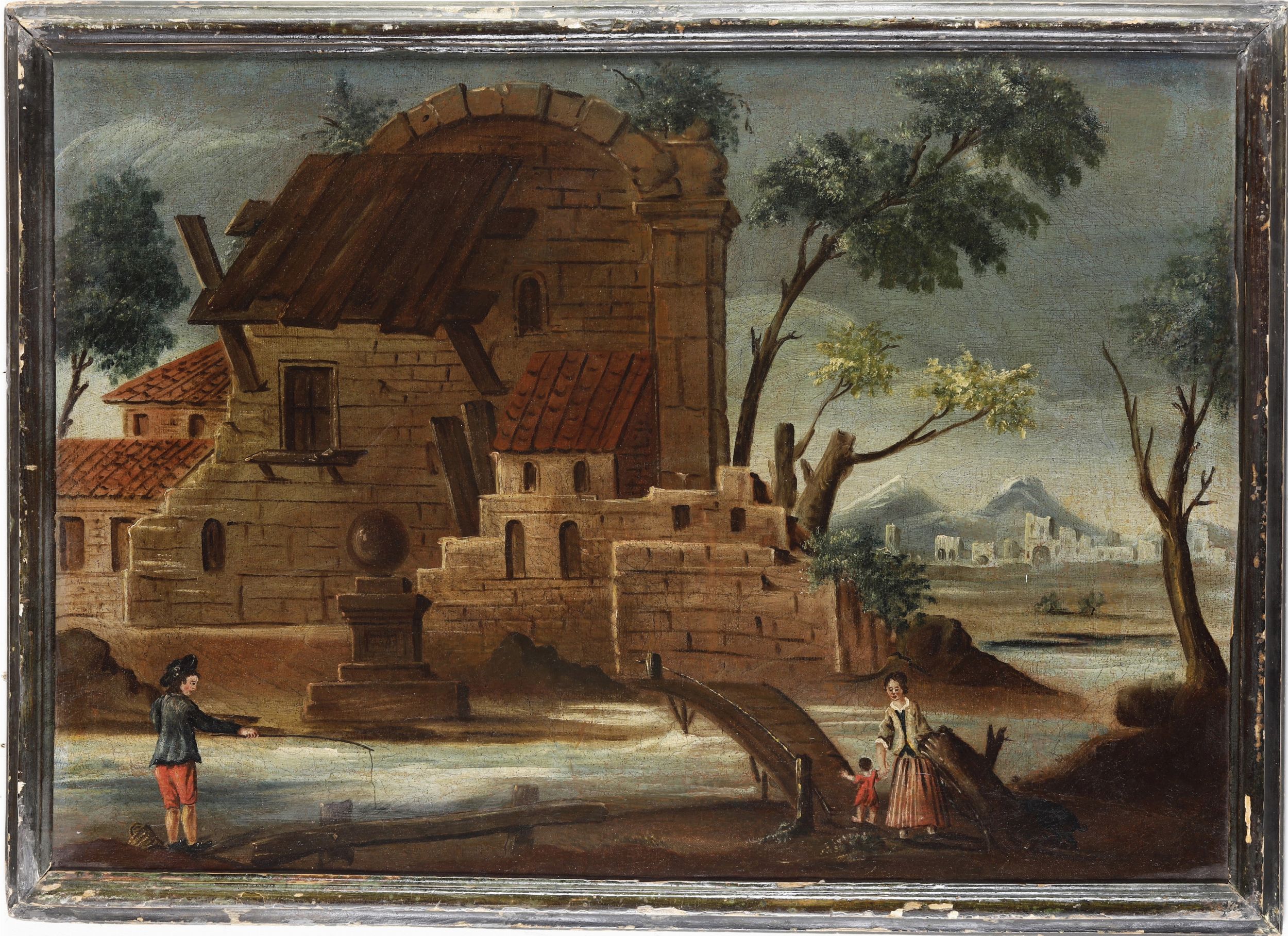 Scuola marchigiana del XVIII secolo Veduta fluviale con case, rovine e viandanti