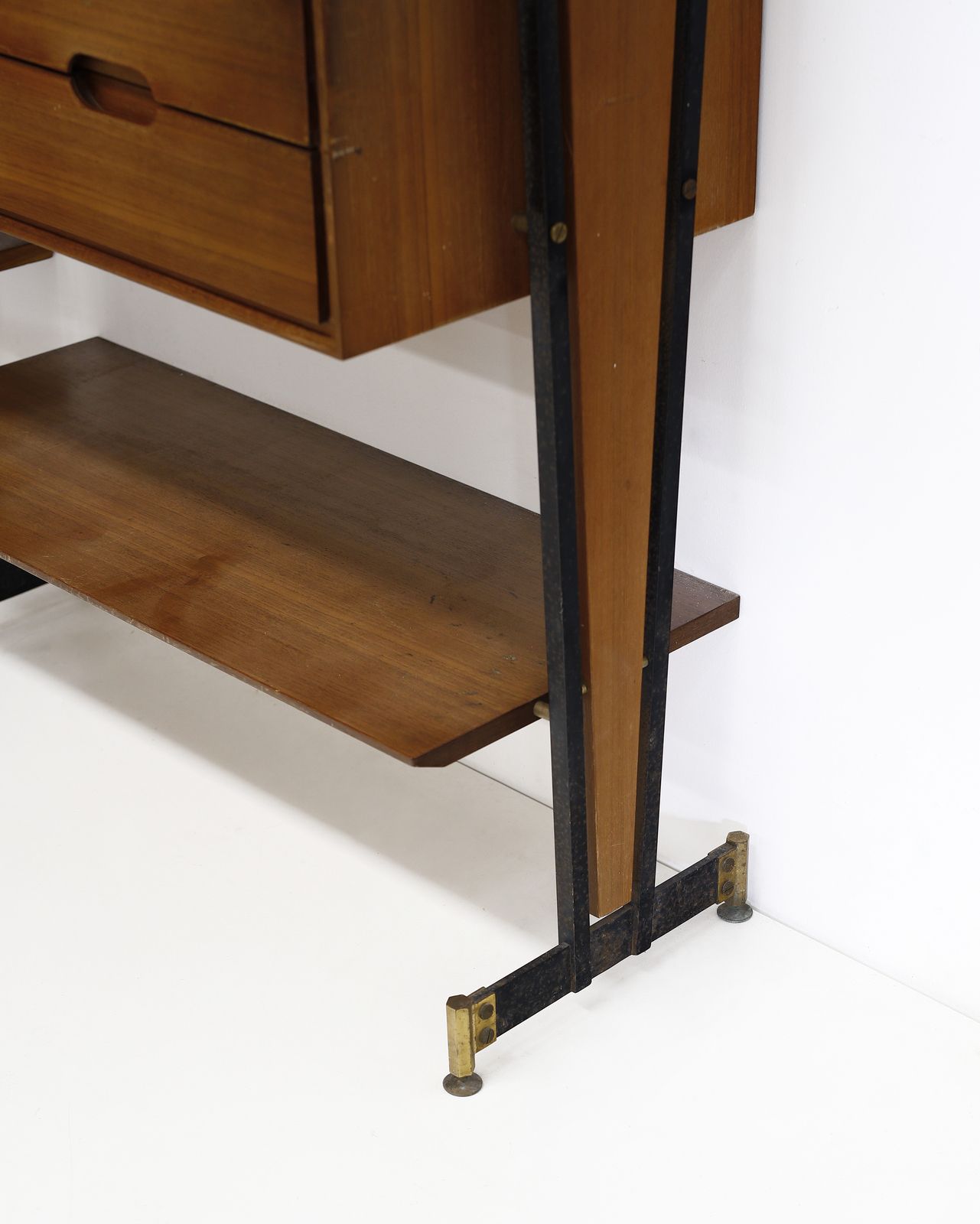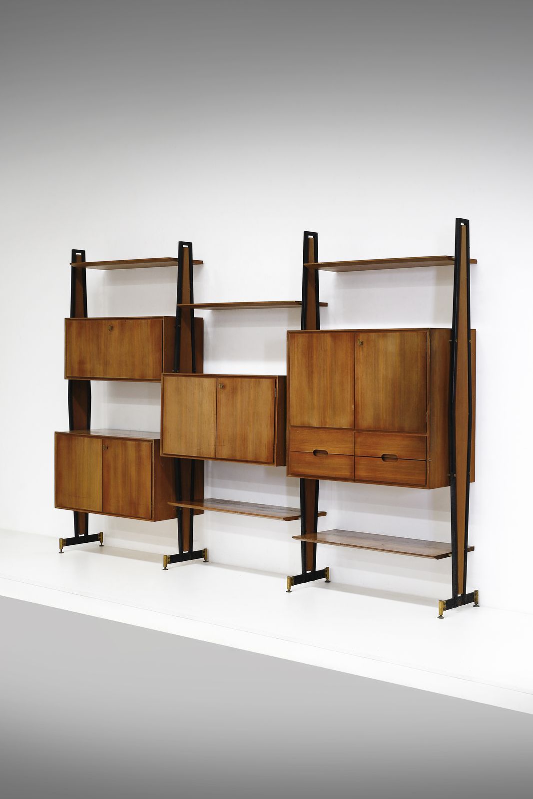 Libreria a tre campate con piani a giorno, stipi e cassetti