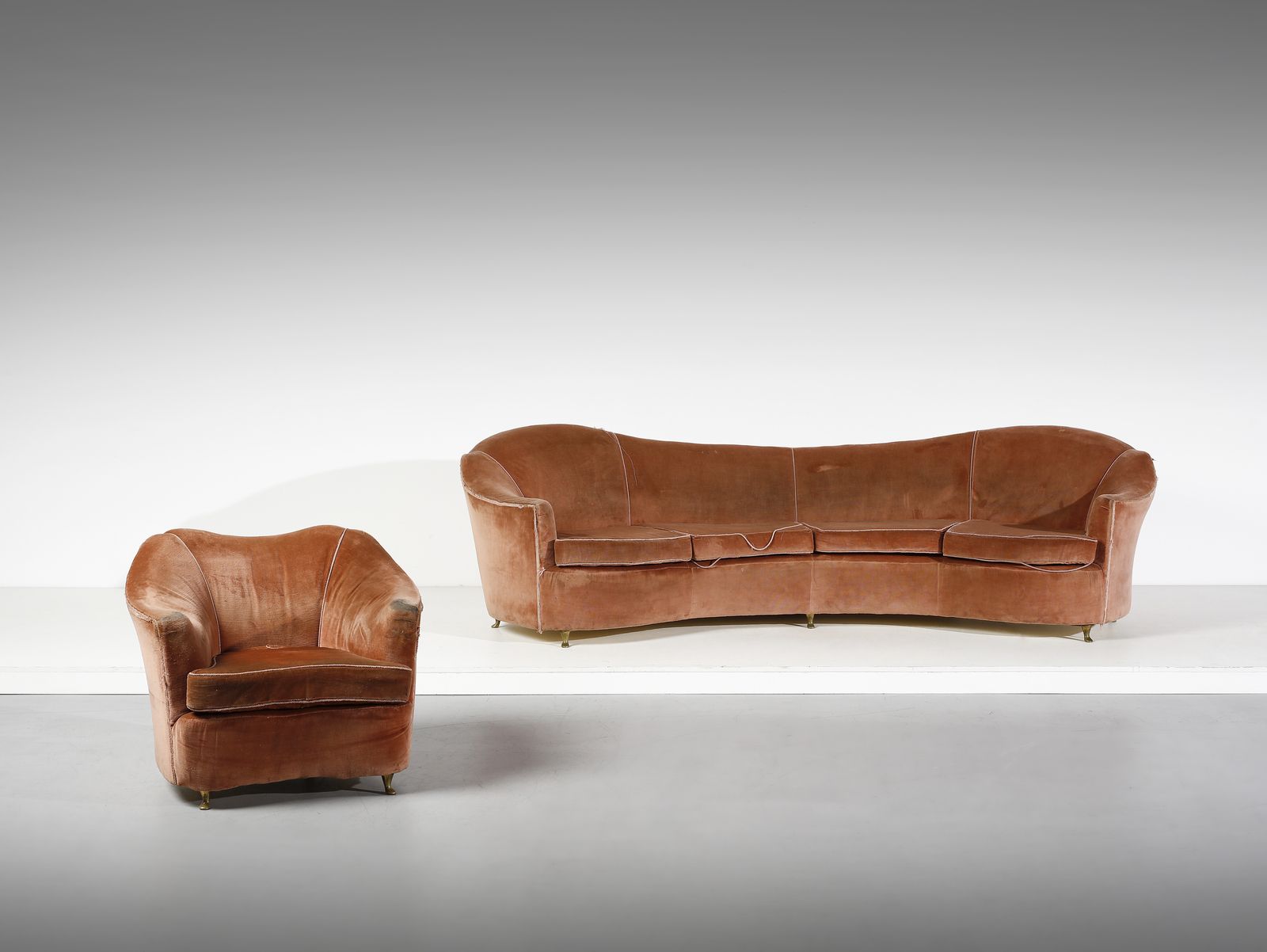 Anni Cinquanta.Dimensioni: divano 80 x 285 x 95. poltrona 71 x 88 x 93 cm