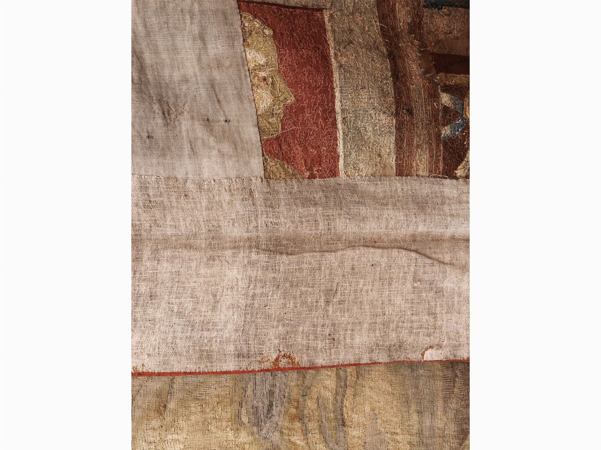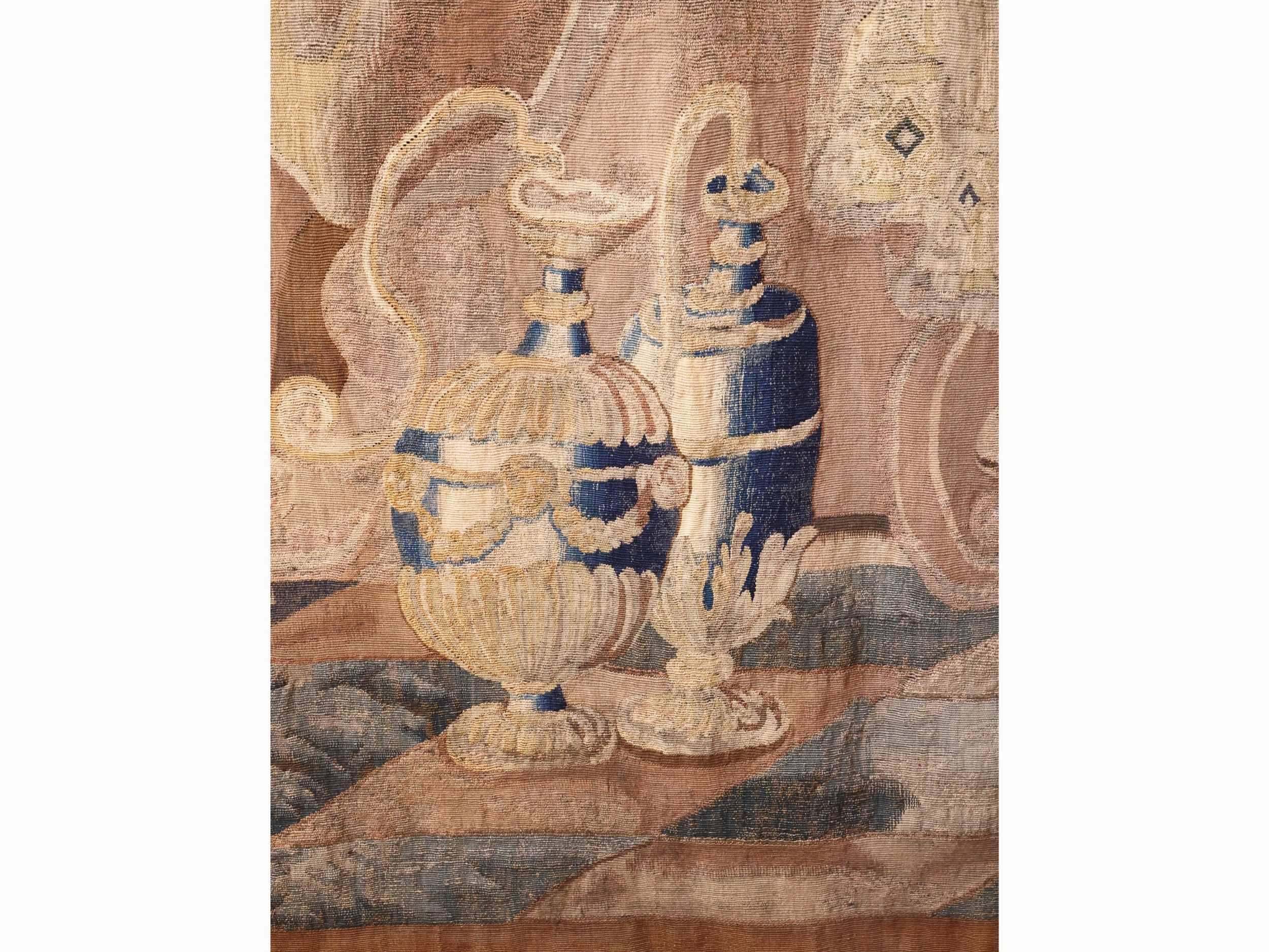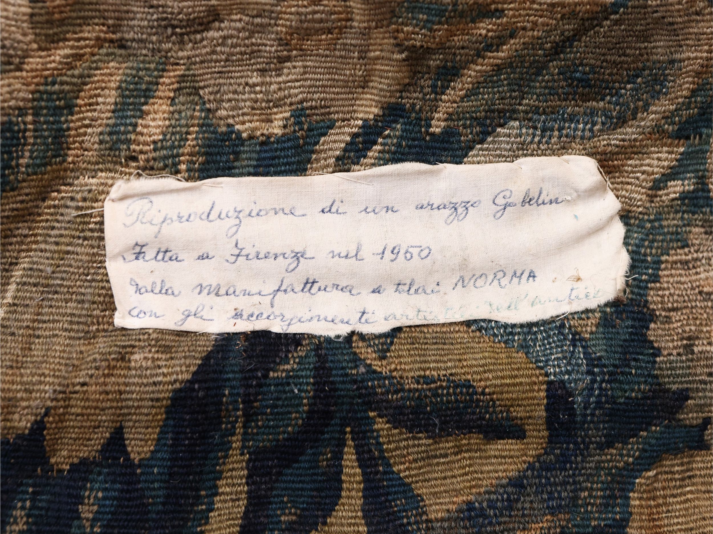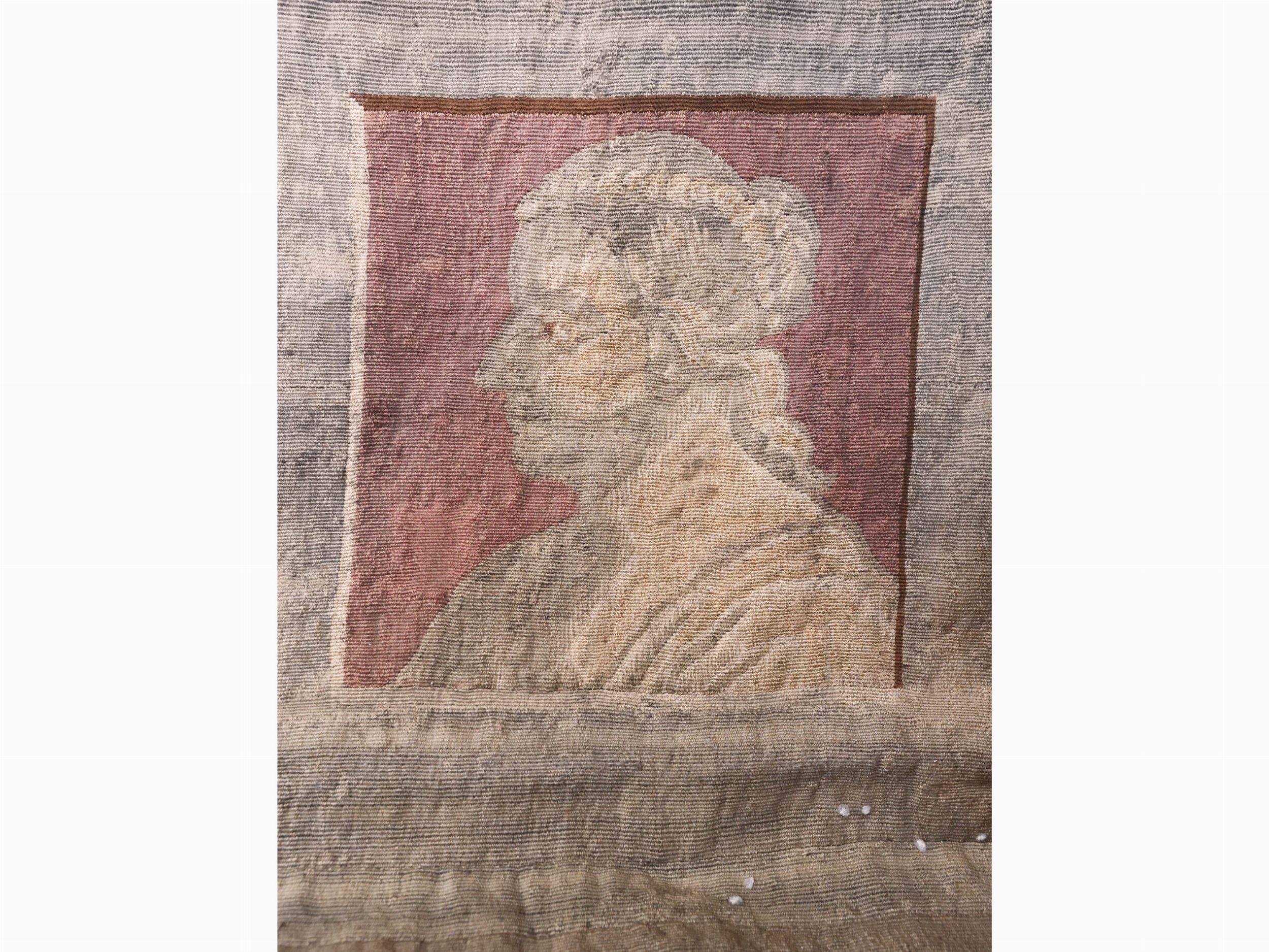 cm 580x370 arazzo con ordito in lana e trama in lana e sete policrome, ampia bordura a ghirlande di fiori e racemi vegetali, che dipartono da coppa centrale, alternati a fiocchi d'amore nella parte inferiore e superiore mentre su entrambi i lati si trovano raffigurate due colonne con capitelli corinzi, anch'esse decorate lungo il fusto dagli stessi festoni disposti a torchon, sulle base effige maschile e femminile all'antica, difetti diffusi