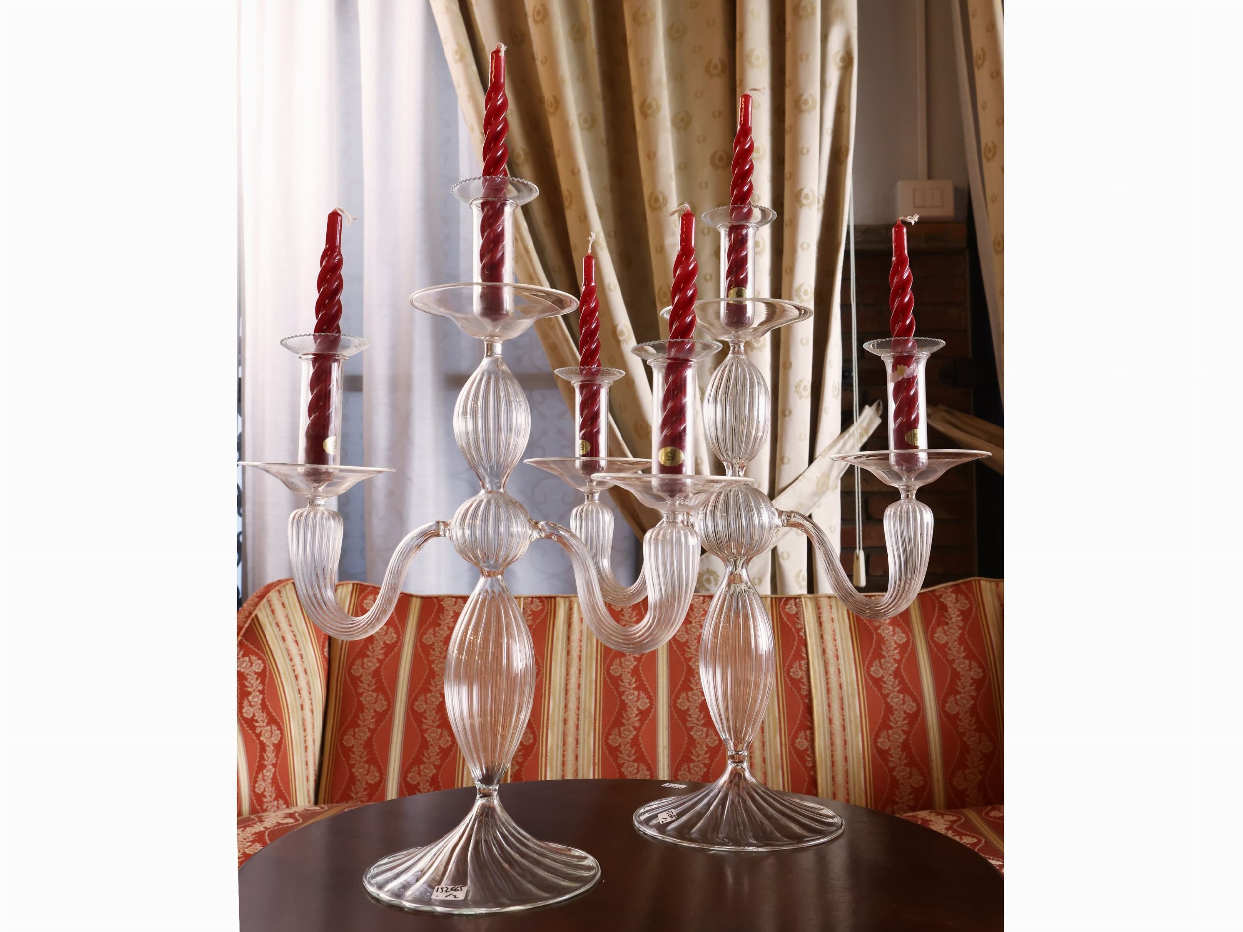 Coppia di grandi candelabri in vetro soffiato trasparente