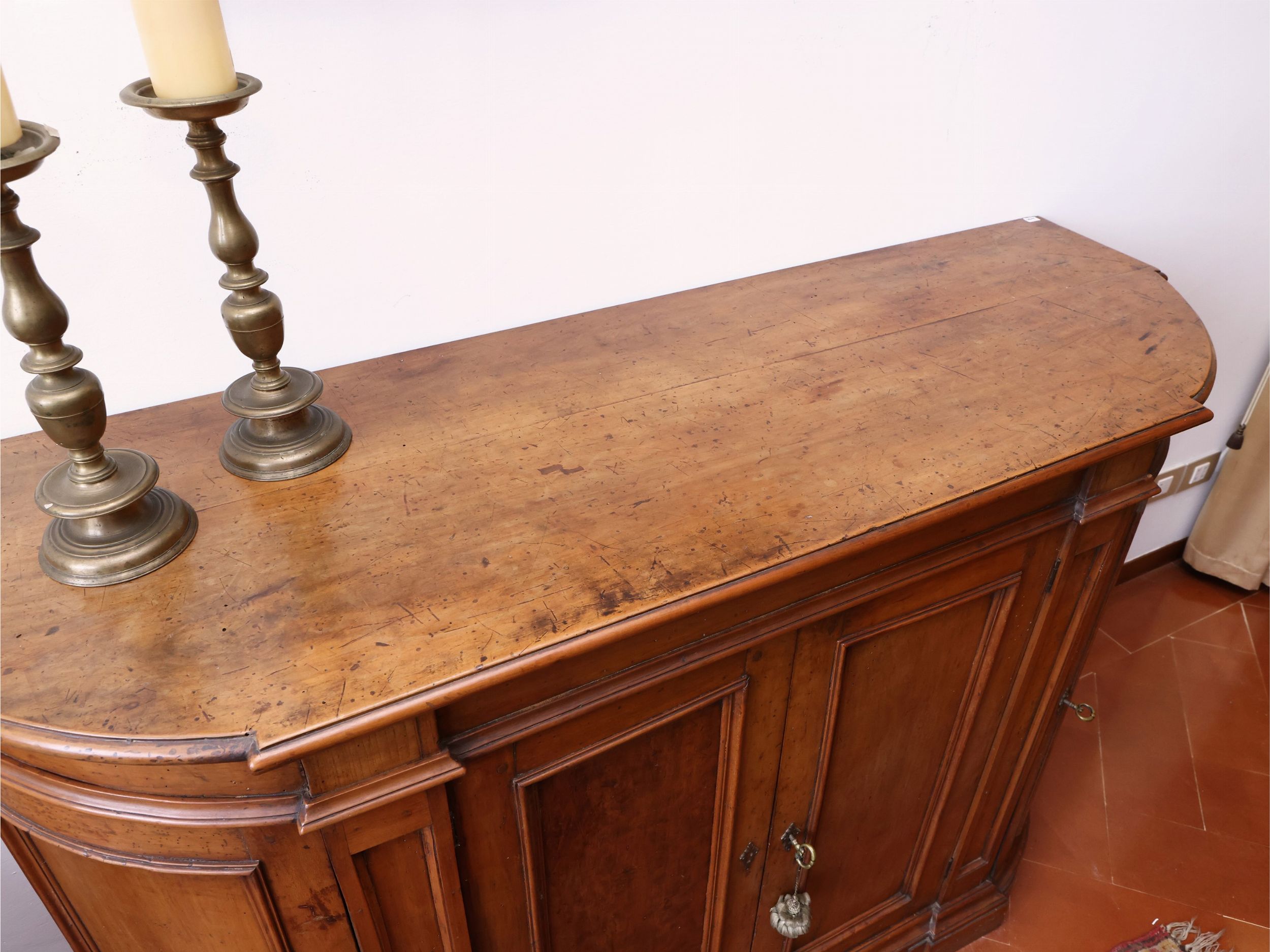 h cm 97x150x50 metà del XVIII secolo piano a mezzaluna sagomato con bordo a becco di civetta, quattro sportelli con cornici modanate a formare riquadri, due dei quali nei fianchi bombati, tra lesene a colonna piatta, piedi a mensola intagliati a volute