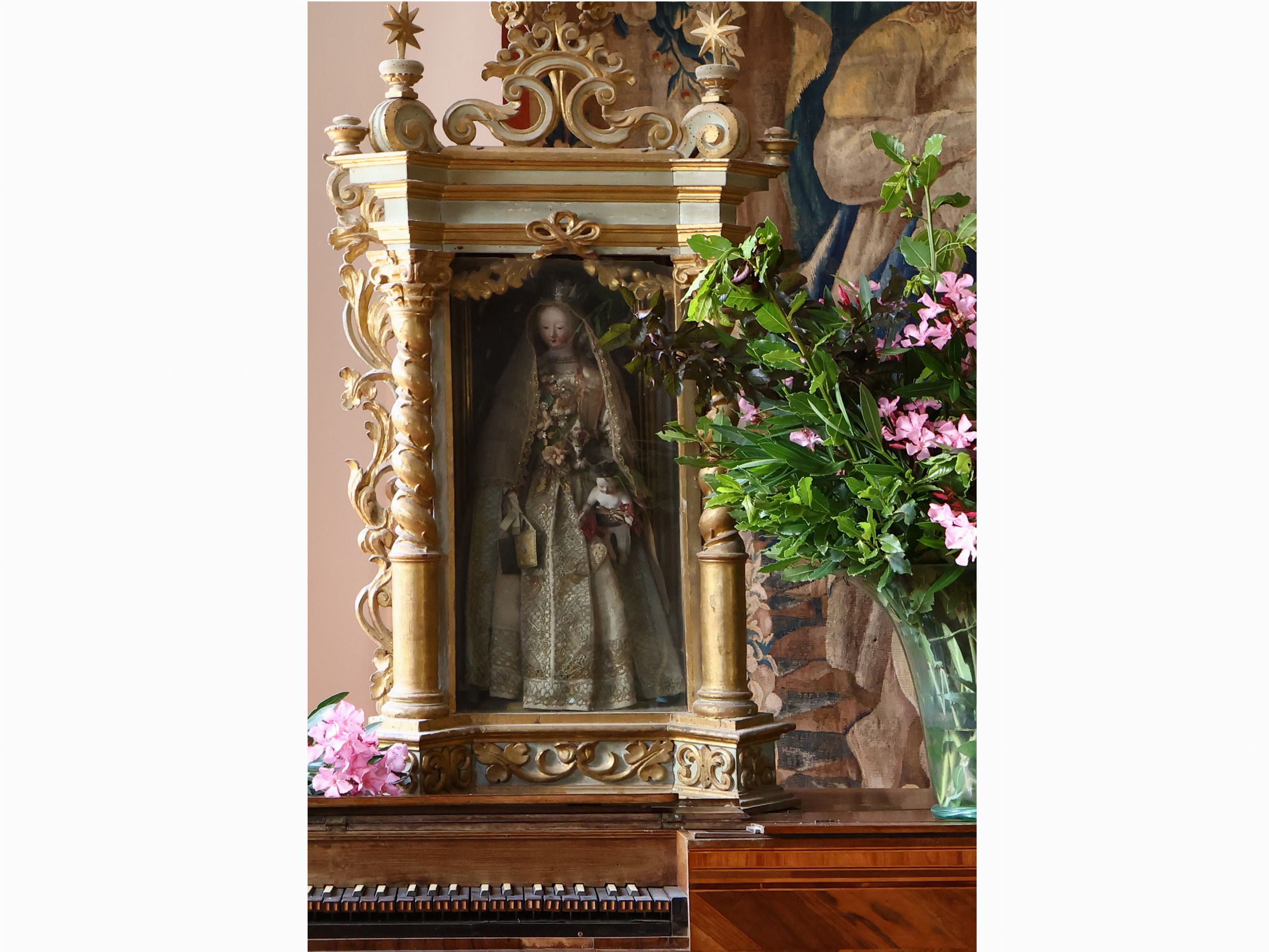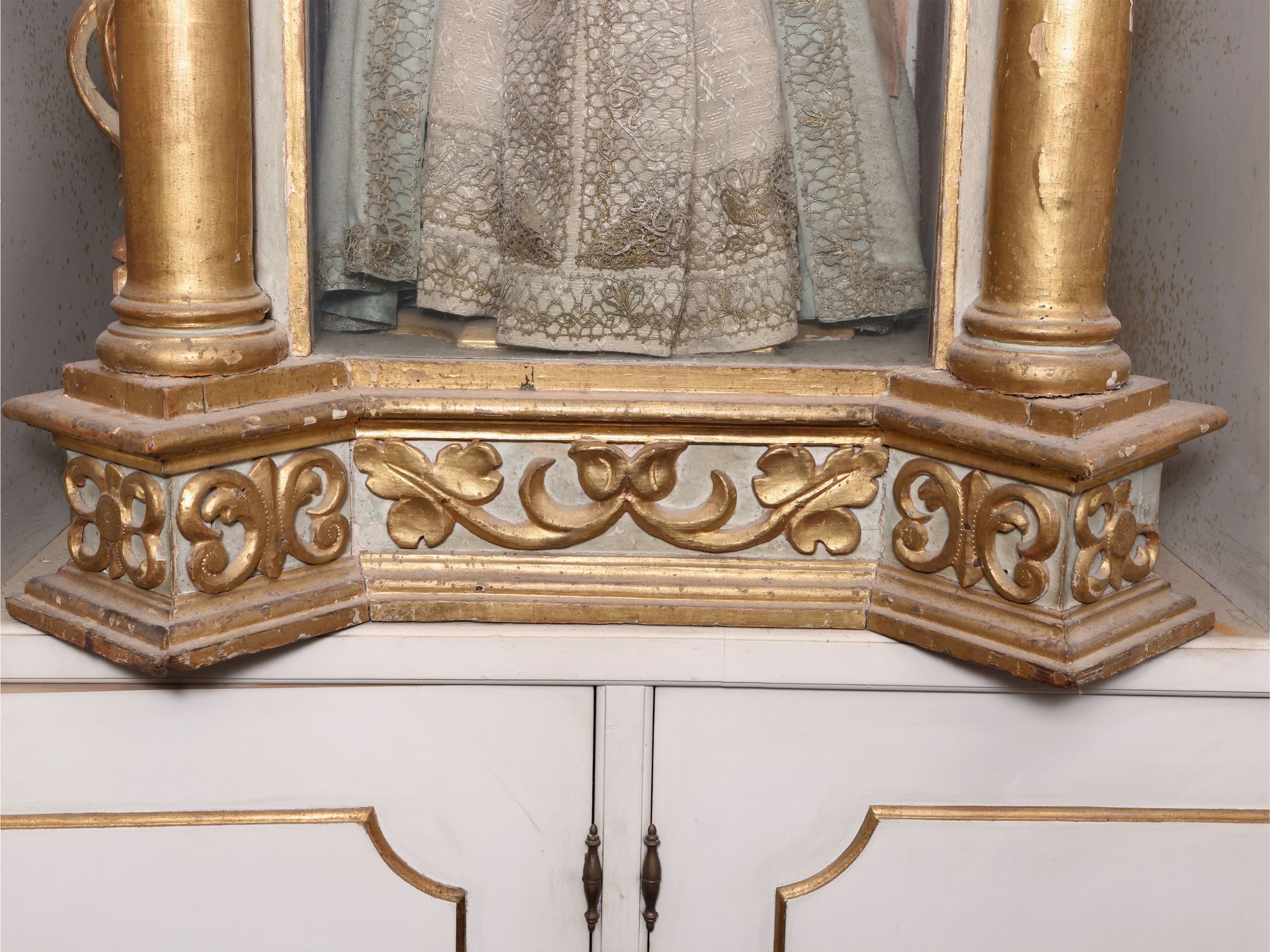 h cm 130x70x52 XVIII/XIX secolo realizzata come un piccolo tempio con lesene a colonna tortile con capitelli corinzi e tralci avviluppati, contenente gruppo devozionale raffigurante Madonna con Bambino con ricche vesti in tessuti antichi e galloni dorati, due fregi di corredo
