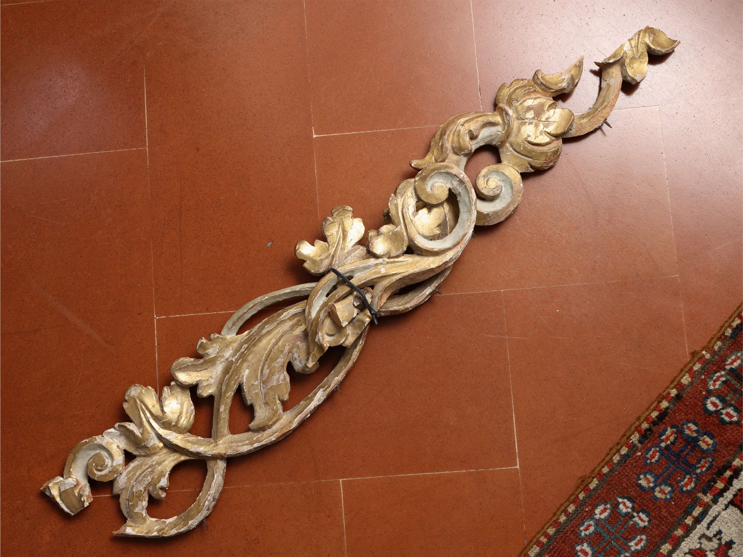 Grande teca in legno intagliato, laccato verde acqua e dorato
