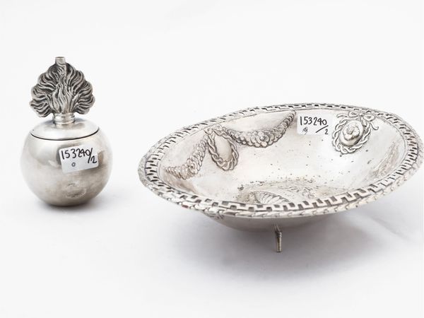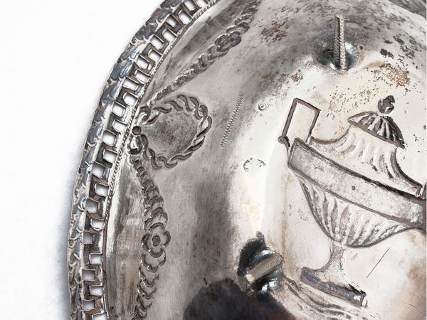 XVIII/XIX secolo un cestino ovale centrato con motivo a vaso e sbalzato con ghirlande e festoni, bordo traforato, probabilmente fine del XVIII secolo, reca punzone non leggibile ed una stoppiniera, di forma sferica con presa a foggia di fiamma, base appesantita, lievi difetti