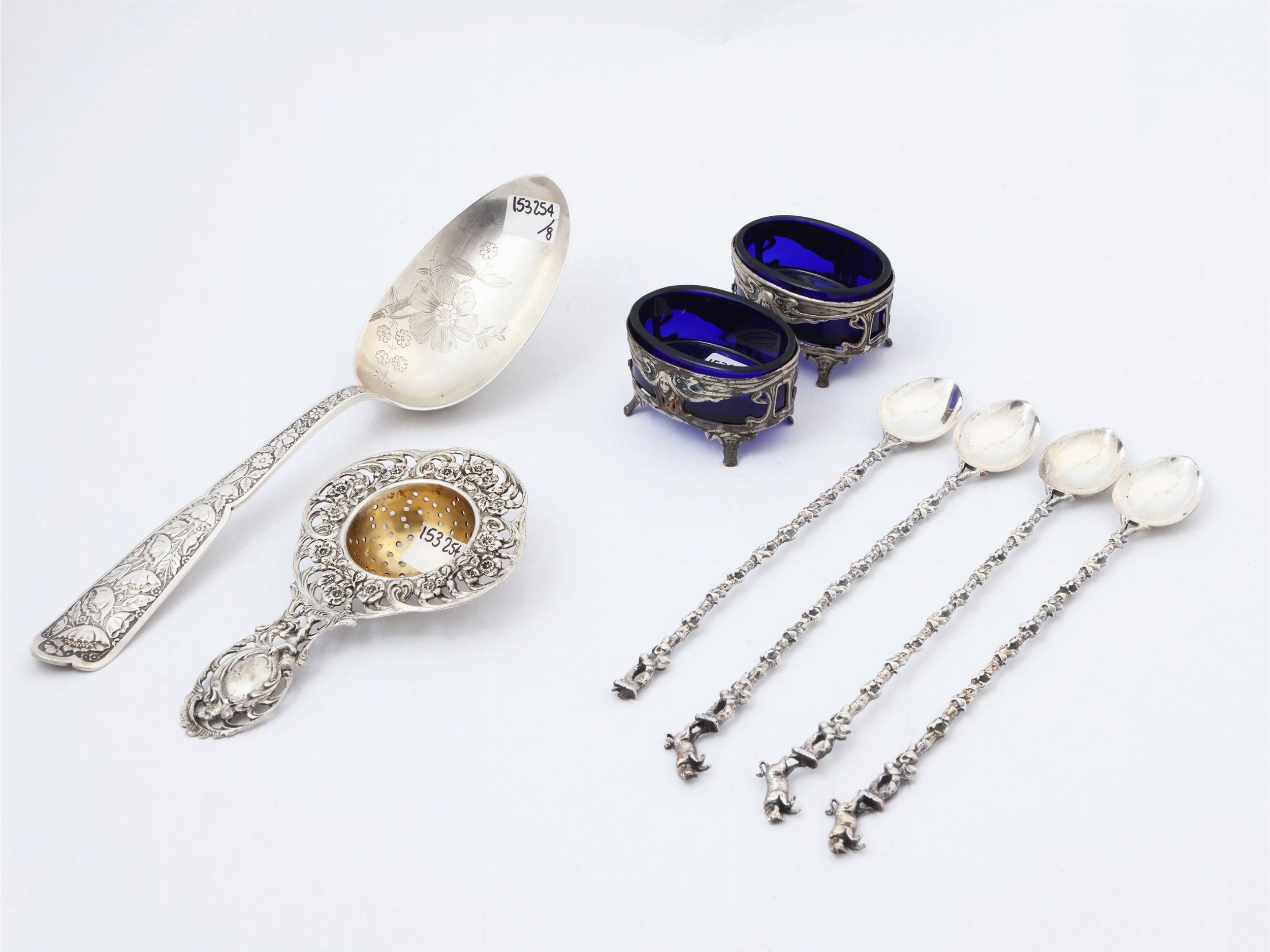 gr 240 (8) inizio del XX secolo tra cui un cucchiaio da portata interamente cesellato con motivo floreale, una serie di quattro cucchiaini con lungo manico realizzato come un tralcio floreale e sormontati da figura di toro (uno mancante) e una coppia di saliere centrate con volto femminile in vetro blu