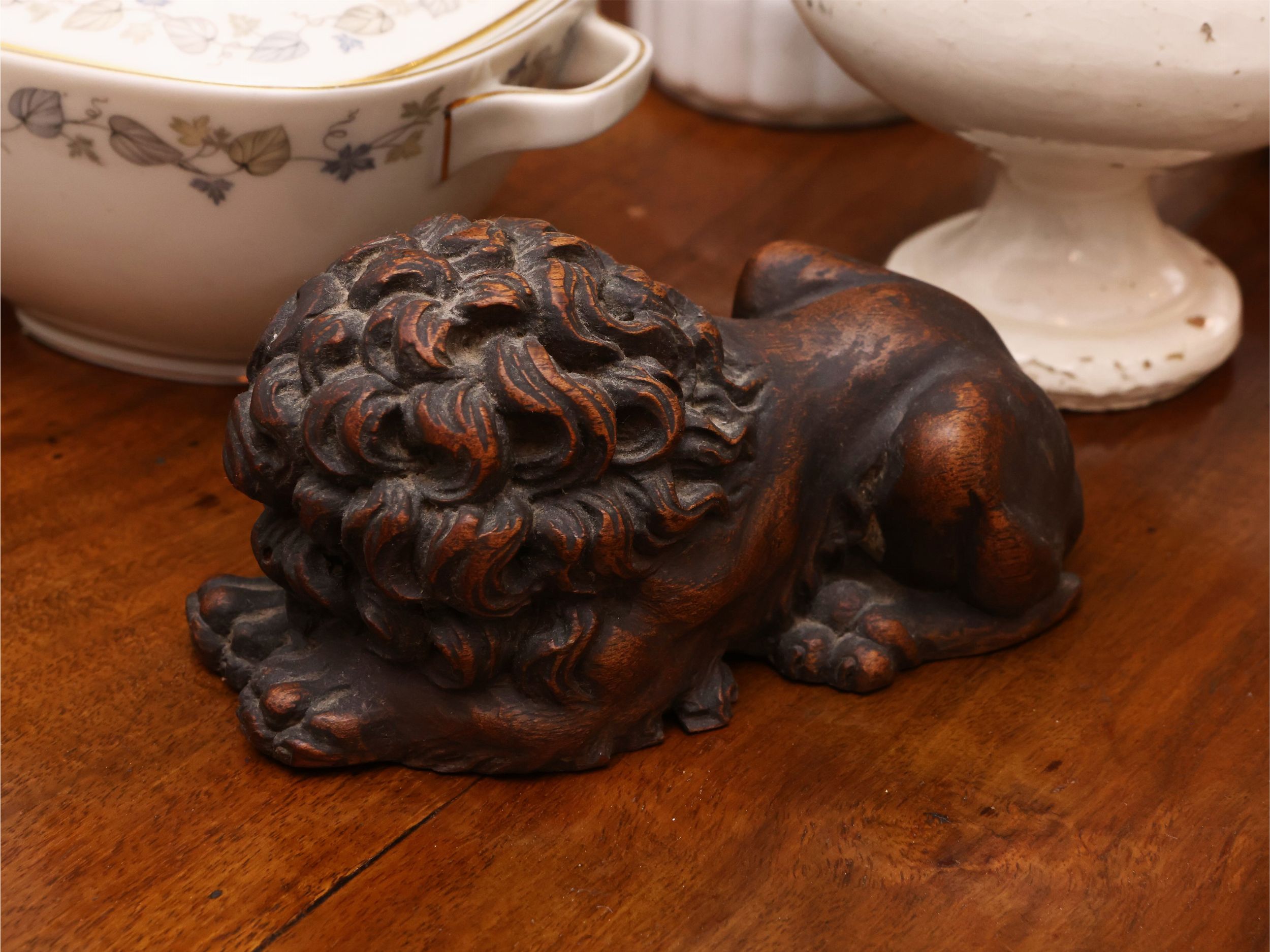 h da cm 4 a cm 19 (11) XIX/XX secolo composto da una scatola souvenir modellata come una cassapanca in miniatura, una piccola scultura lignea raffigurate un leone dormiente, un gatto in vetro soffiato, una piccola scatola corcolare in argento ed un assortimento di porcellane, alcuni difetti