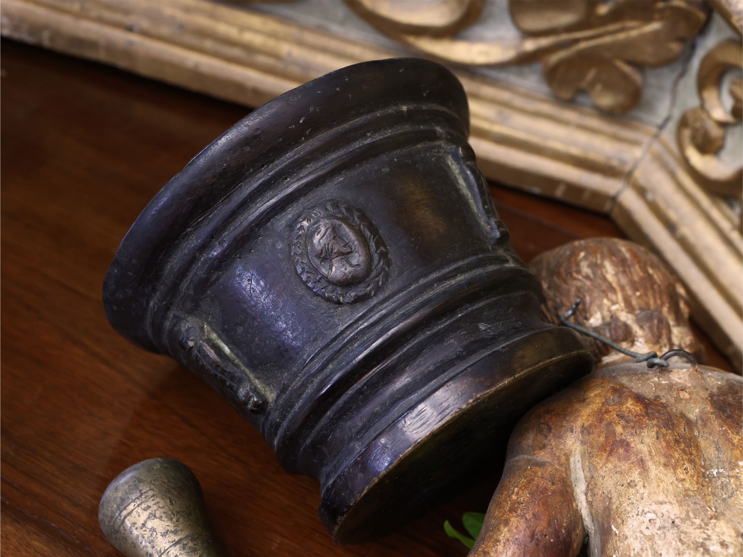 XVII secolo sbalzato con medaglioni con profili classici a bassorilievo entro ghirlande, corredato da pestello, abbinato ad una figura di Gesù Bambino in terracotta, difetti