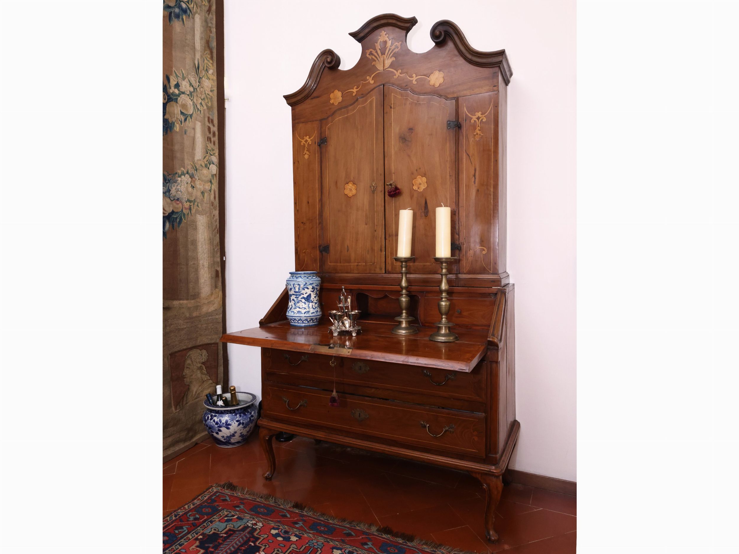 h cm 225x112x53 metà del XVIII secolo intarsiata con filettature in legni di frutto a formare volute, cappello sagomato con cimasa timpano spezzato, due sportelli, nella parte inferiore calatoio a celare scarabattolo con due cassettini e vano, due cassetti sul fronte dritto, piedi mossi desinenti a ricciolo