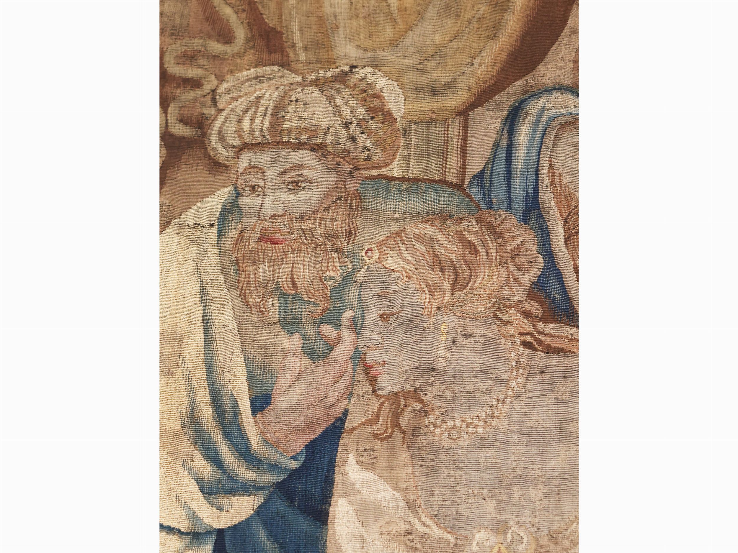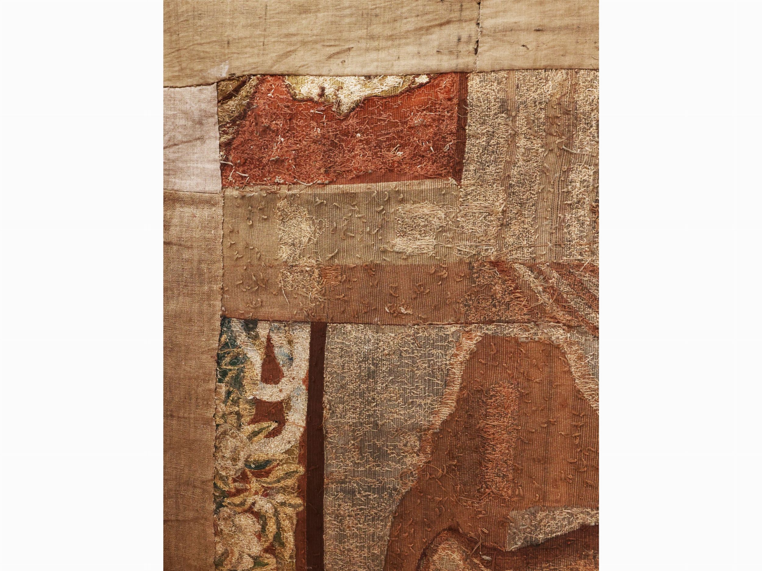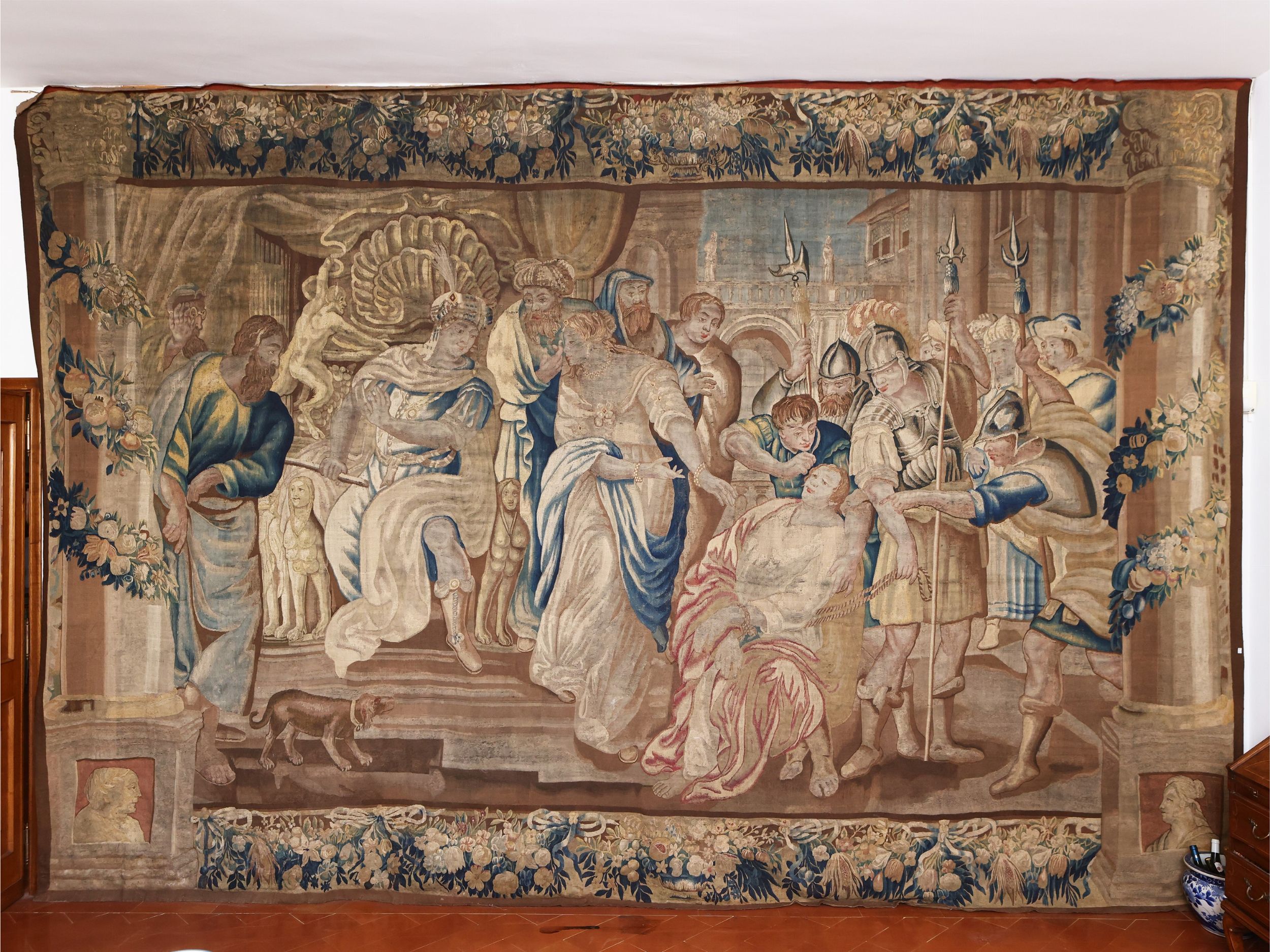 cm 515x350 arazzo con ordito in lana e trama in lana e sete policrome, ampia bordura a ghirlande di fiori e racemi vegetali, che dipartono da coppa centrale, alternati a fiocchi d'amore nella parte inferiore e superiore mentre su entrambi i lati si trovano raffigurate due colonne con capitelli corinzi, anch'esse decorate lungo il fusto dagli stessi festoni disposti a torchon, sulle base effige maschile e femminile all'antica, difetti diffusi