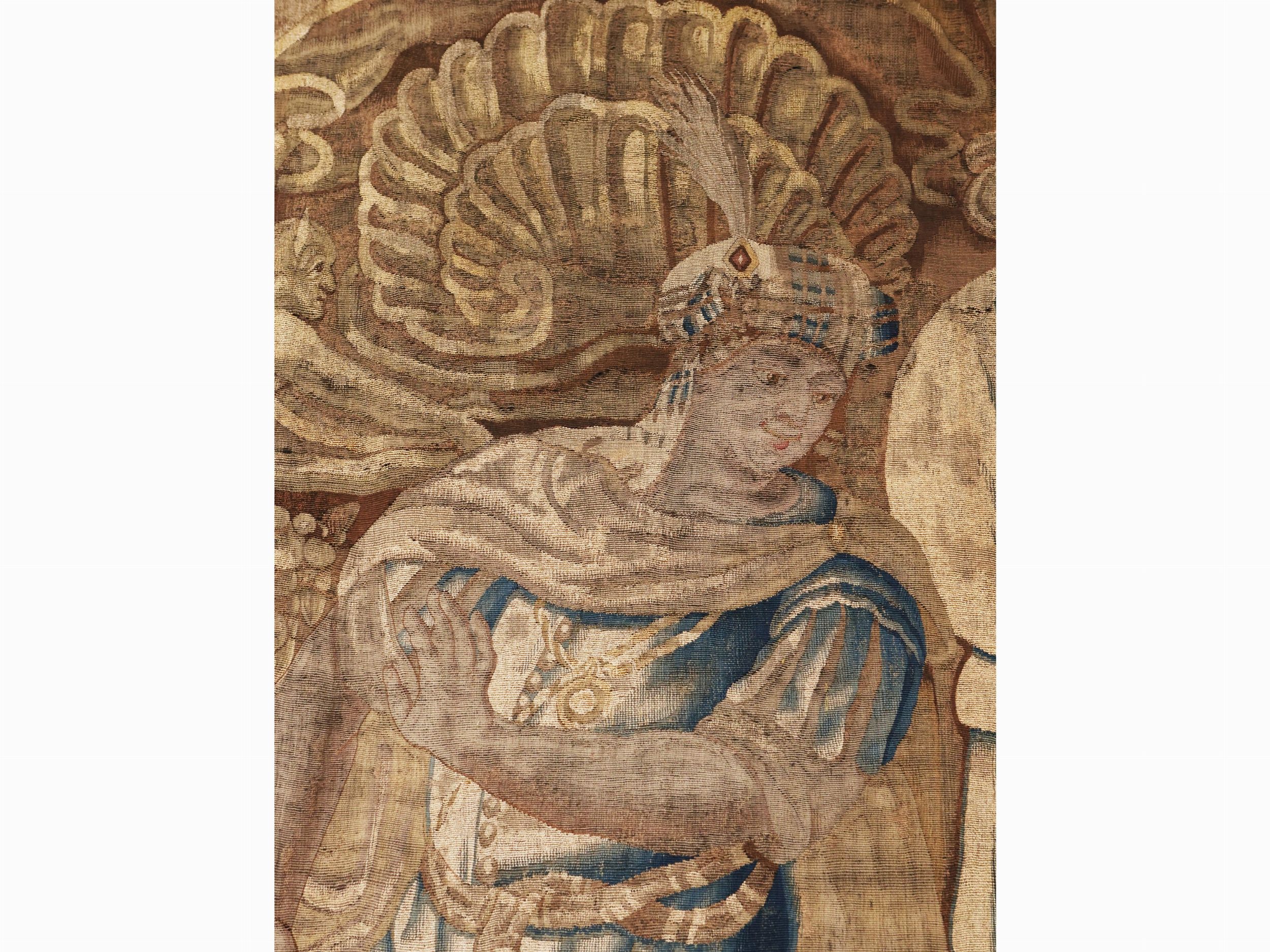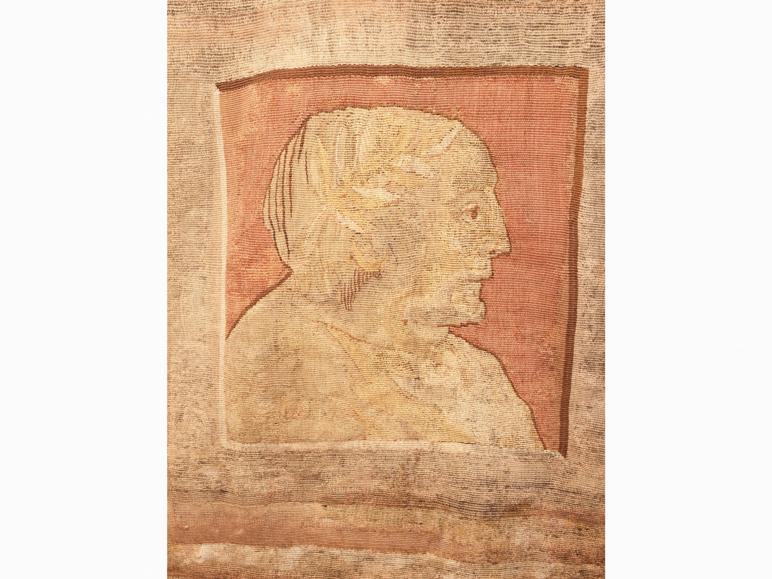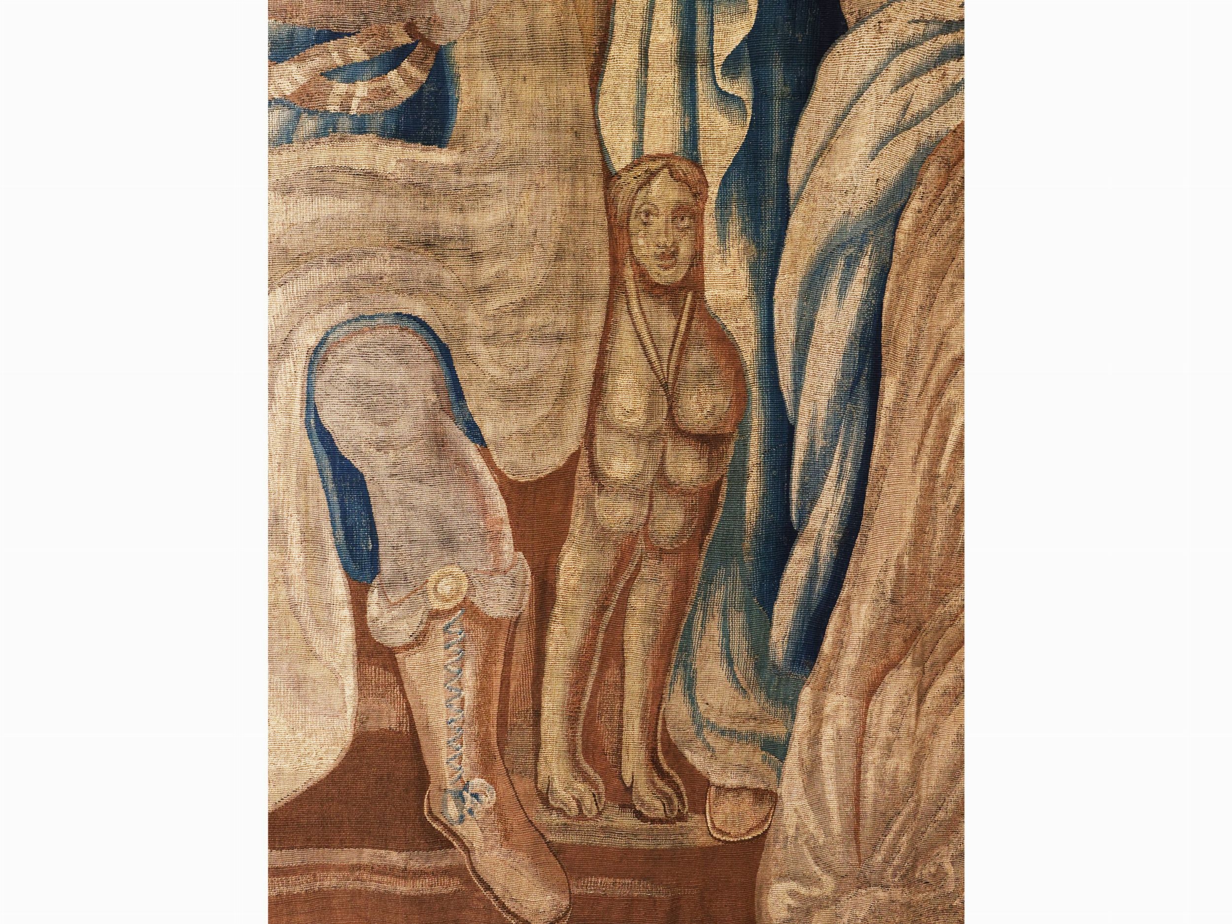 cm 515x350 arazzo con ordito in lana e trama in lana e sete policrome, ampia bordura a ghirlande di fiori e racemi vegetali, che dipartono da coppa centrale, alternati a fiocchi d'amore nella parte inferiore e superiore mentre su entrambi i lati si trovano raffigurate due colonne con capitelli corinzi, anch'esse decorate lungo il fusto dagli stessi festoni disposti a torchon, sulle base effige maschile e femminile all'antica, difetti diffusi