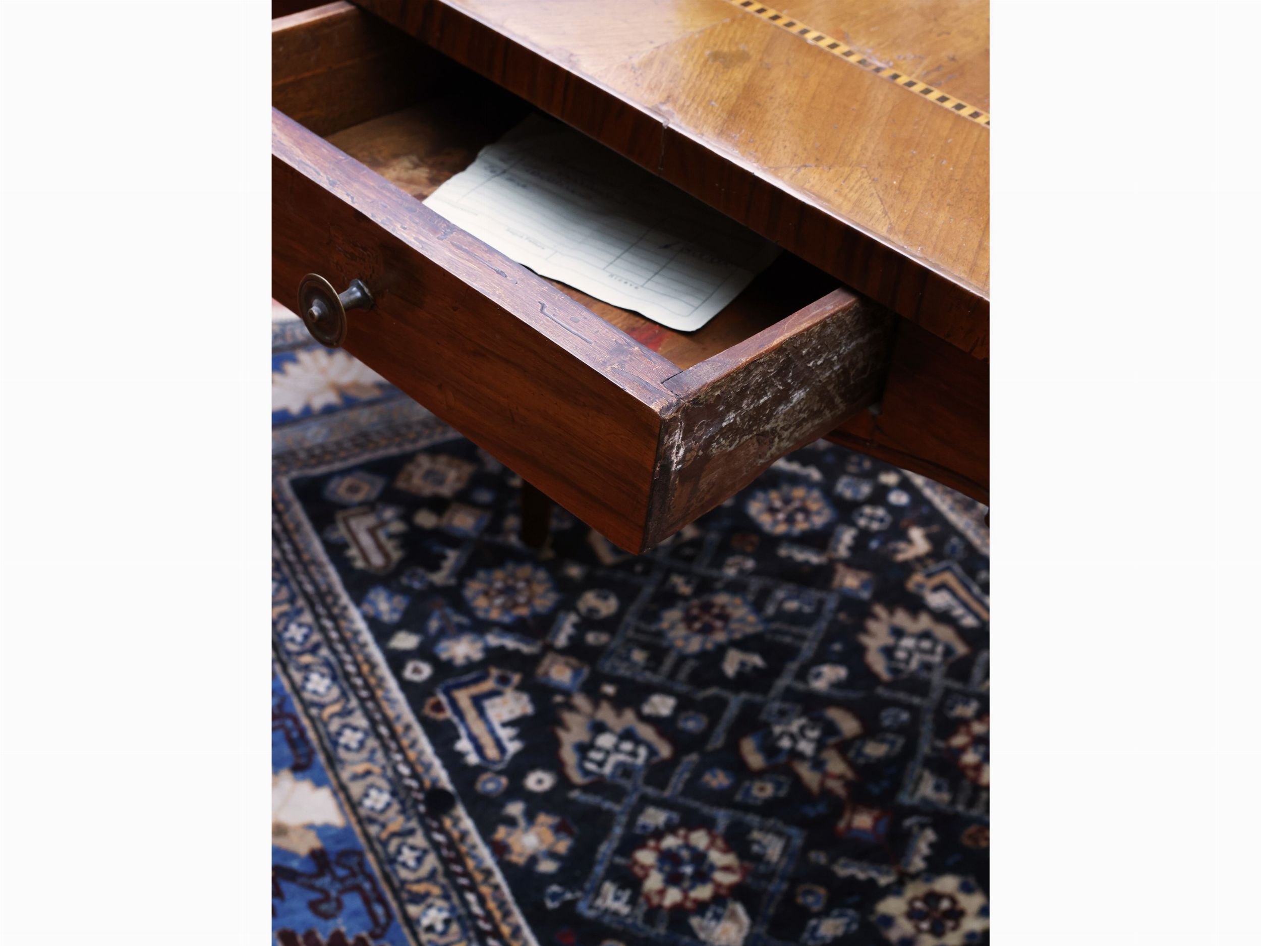 seconda metà del XVIII secolo piano impiallacciato ed intarsiato con filettatura bicolore, un cassettino nella fascia, gambe mosse con piedini a ricciolo, alcuni difetti