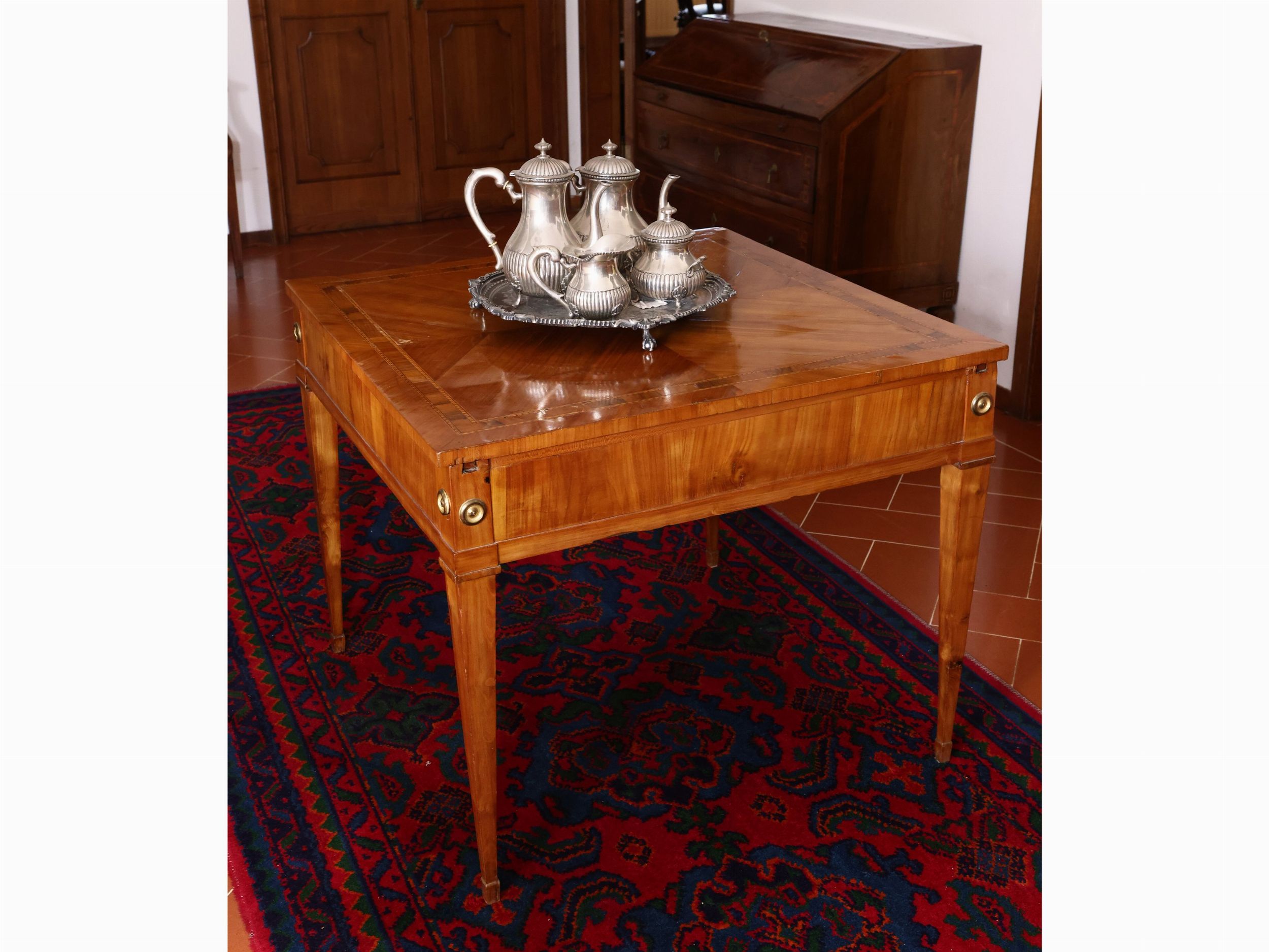 h cm 71x85x85 Toscana, fine del XVIII secolo piano di forma quadrata, intarsiato con doppia filettatura a nastro ed a piccoli motivi romboidali, che scorre nei due sensi a celare tre vani disposti verticalmente ed uno in orizzontale, gambe a faretra con applicazione di borchie in bronzo dorato, piedini a dado