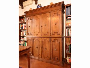 h cm 242x200x55 XVII secolo cappello con bordo modanato aggettante, otto sportelli con formelle scantonate in [..]