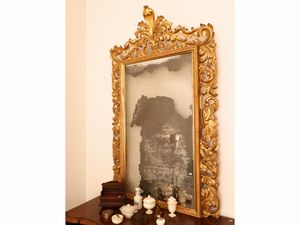h cm 90x84x72 inizio del XX secolo cornice intagliata a volute e motivi floreali, gambe mosse con piedini a ricciolo, [..]