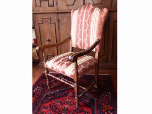 h cm 120 realizzato in stile seicentesco, ampi braccioli a giorno a voluta, gambe anteriori e traverse tornite, [..]